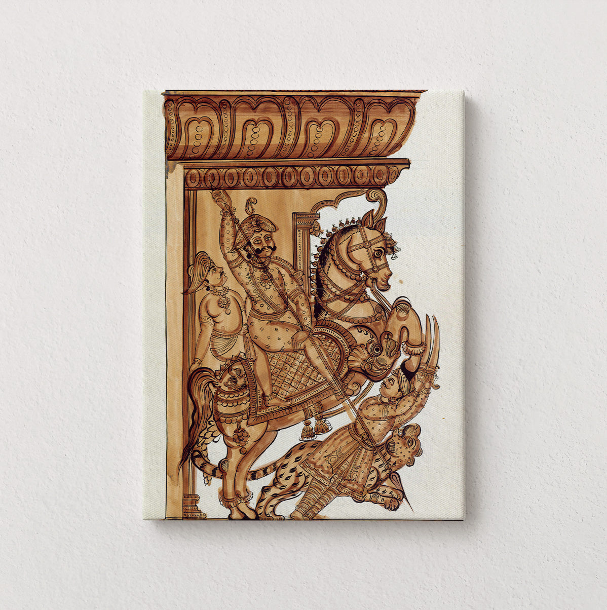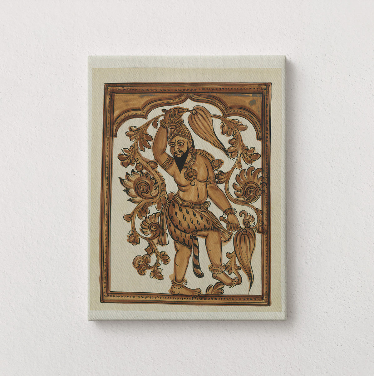 Rendered in warm earth tones and rhythmic linework, each painting reflects the distinctive visual language of the Chidambaram shrine. Deities, dancers, guardians, and mythic encounters are framed within ornamental geometry that mirrors temple ceilings, pillars, and sanctums. The palette of ochre, sienna, and deep umber gives the collection a grounded presence that feels both ancient and quietly contemporary.