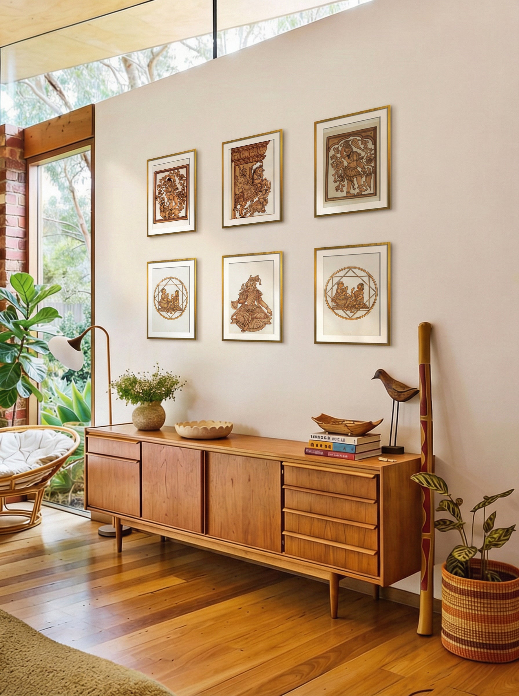 This bundle is designed to be experienced as a set. Together, the artworks form a visual meditation on devotion, movement, and sacred space. Displayed as a series, they create a sense of continuity that echoes the processional rhythm of temple corridors and storytelling panels.