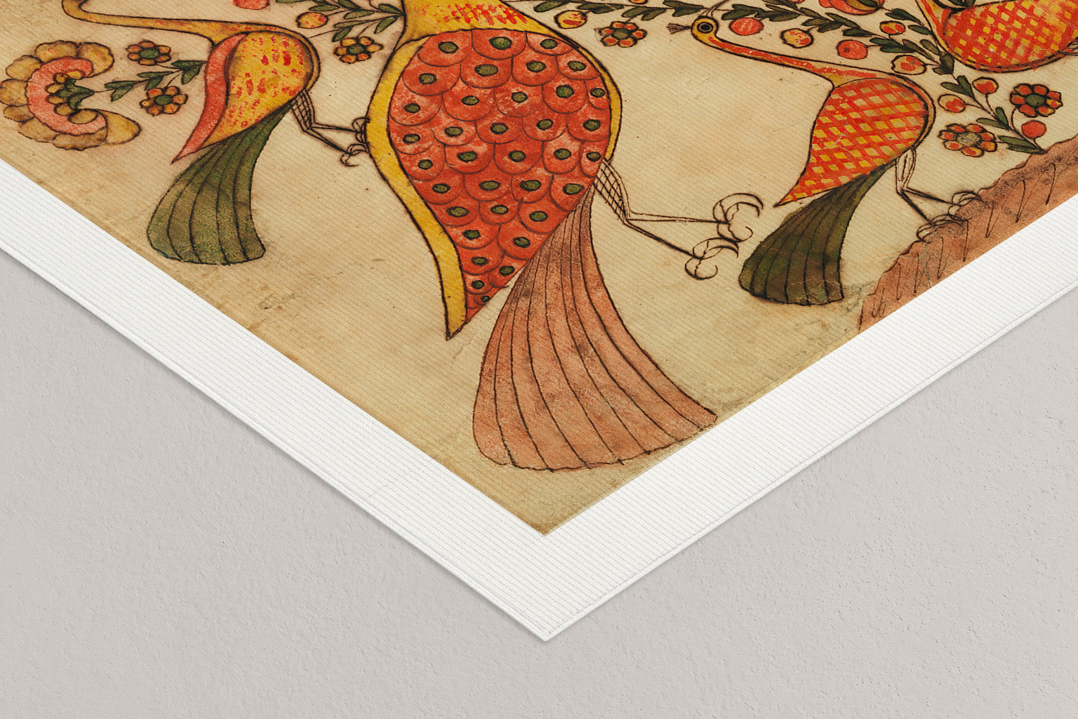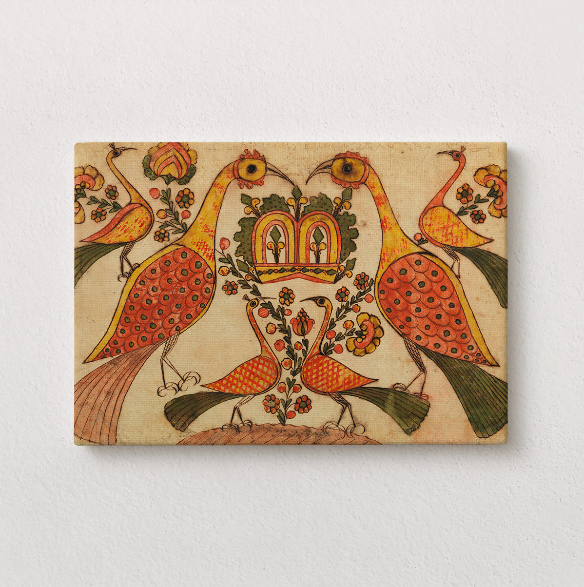 Rendered in warm ochres, coral reds, soft greens, and inked outlines, the peacocks appear both ornamental and watchful. Their patterned plumage unfolds in rhythmic repetition, while smaller birds gather beneath them, completing a gentle hierarchy of scale and meaning. The composition feels ceremonial, as if the image itself were a blessing arranged through form and color.