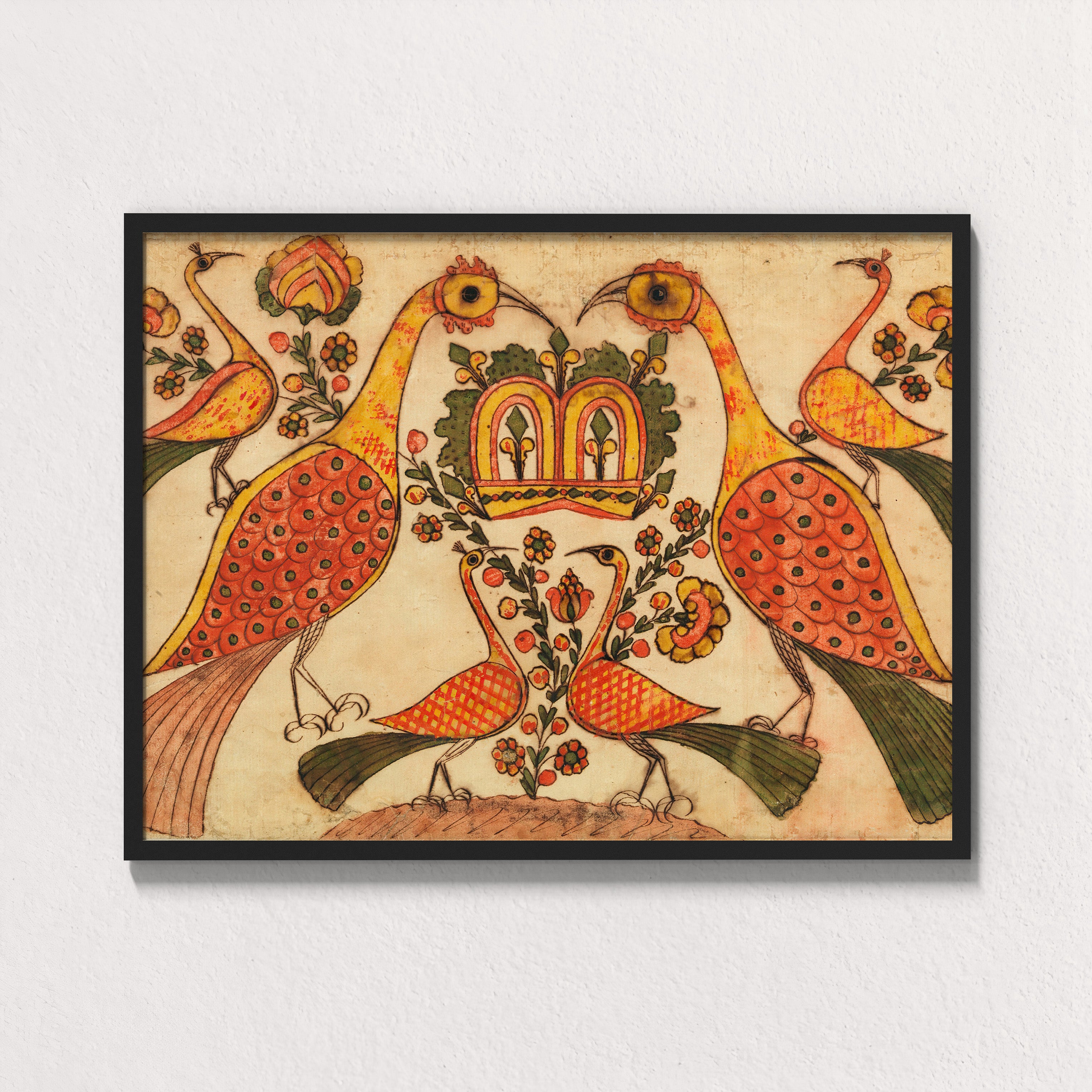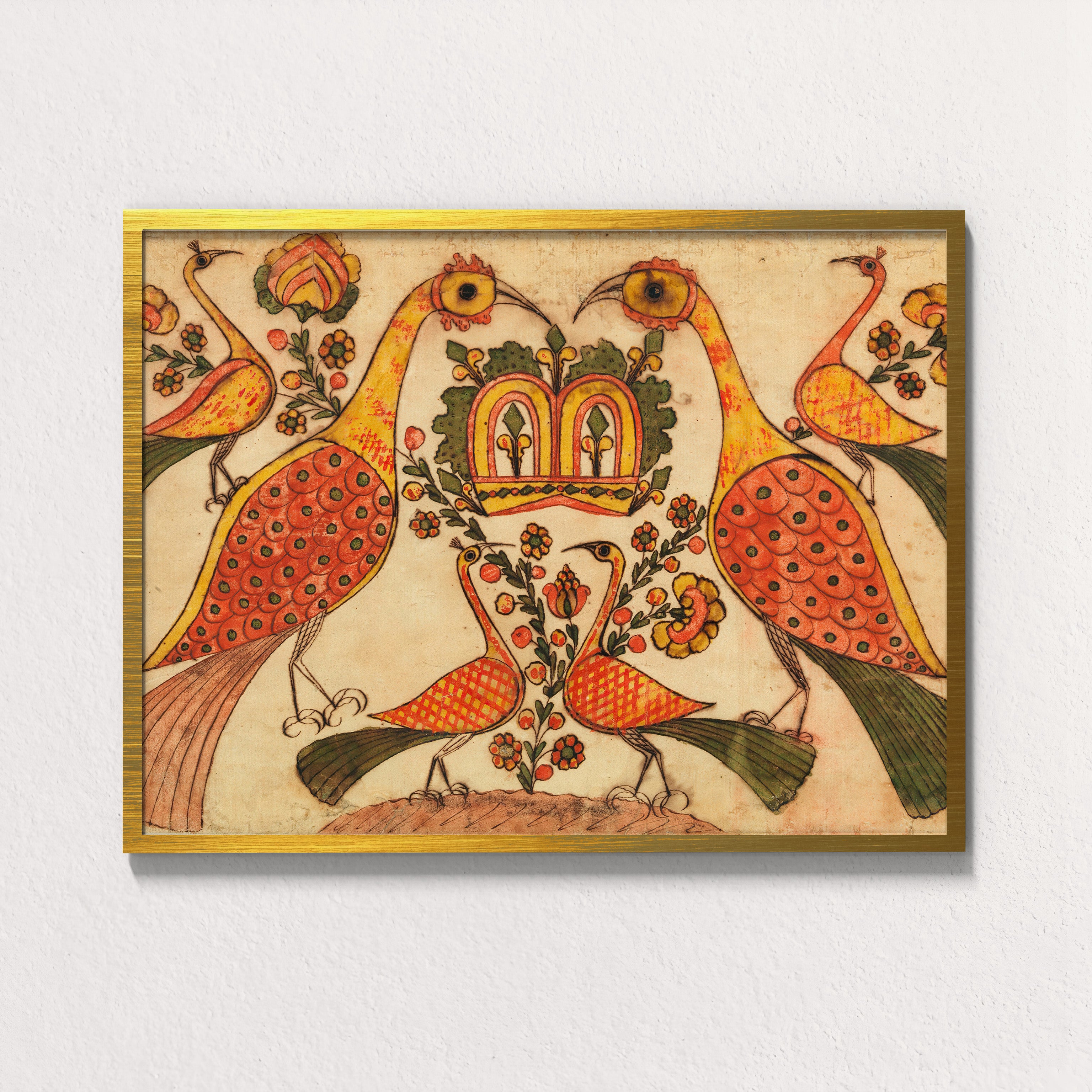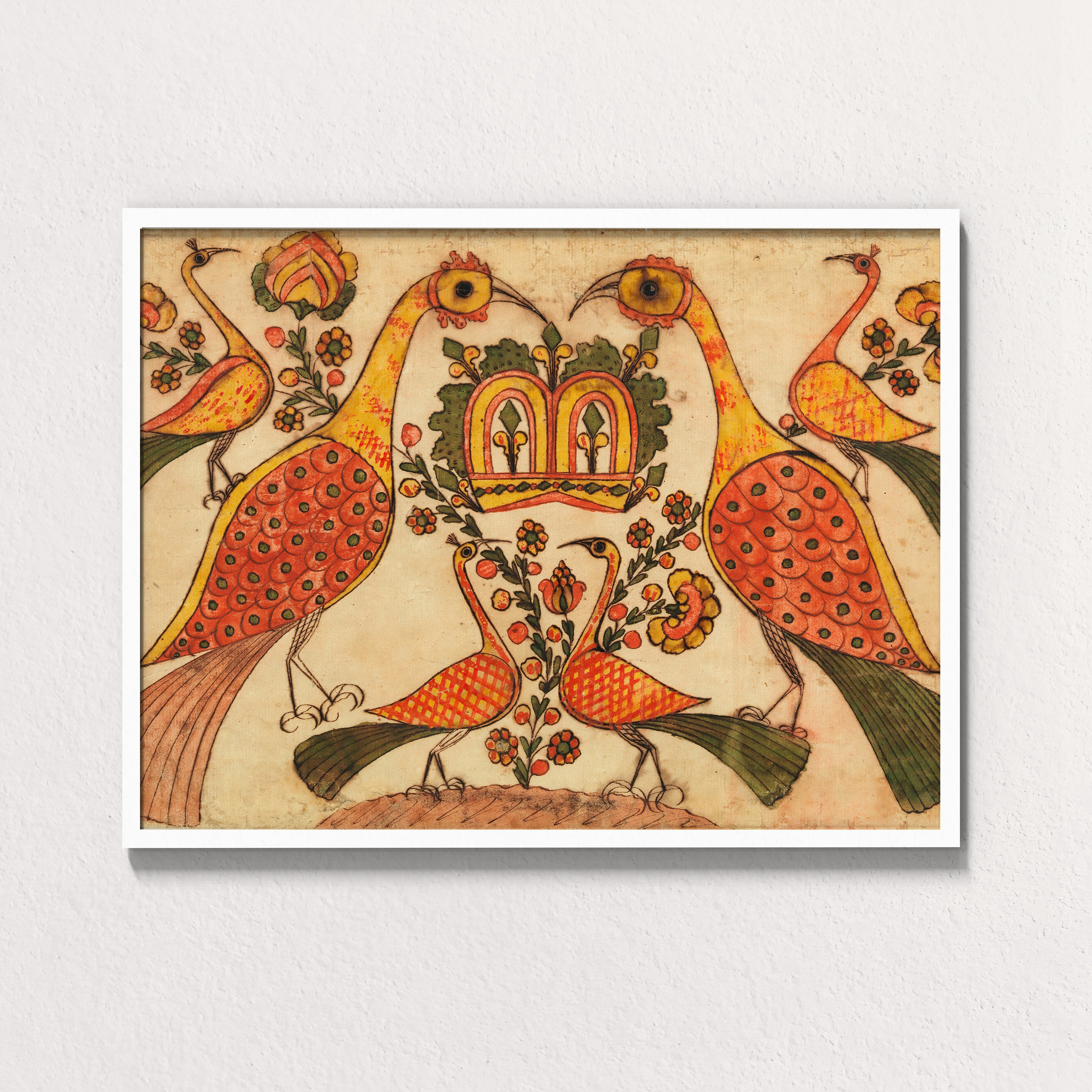 Crowned by Balance is a radiant folk composition attributed to Johann Heinrich Otto, drawing from Palampore and Fraktur-inspired motifs that bridged South Indian textile design with European decorative traditions in the 18th century. At its heart, two regal peacocks stand mirrored in perfect symmetry, their long necks curving inward to guard a crowned bloom of foliage and flowers.