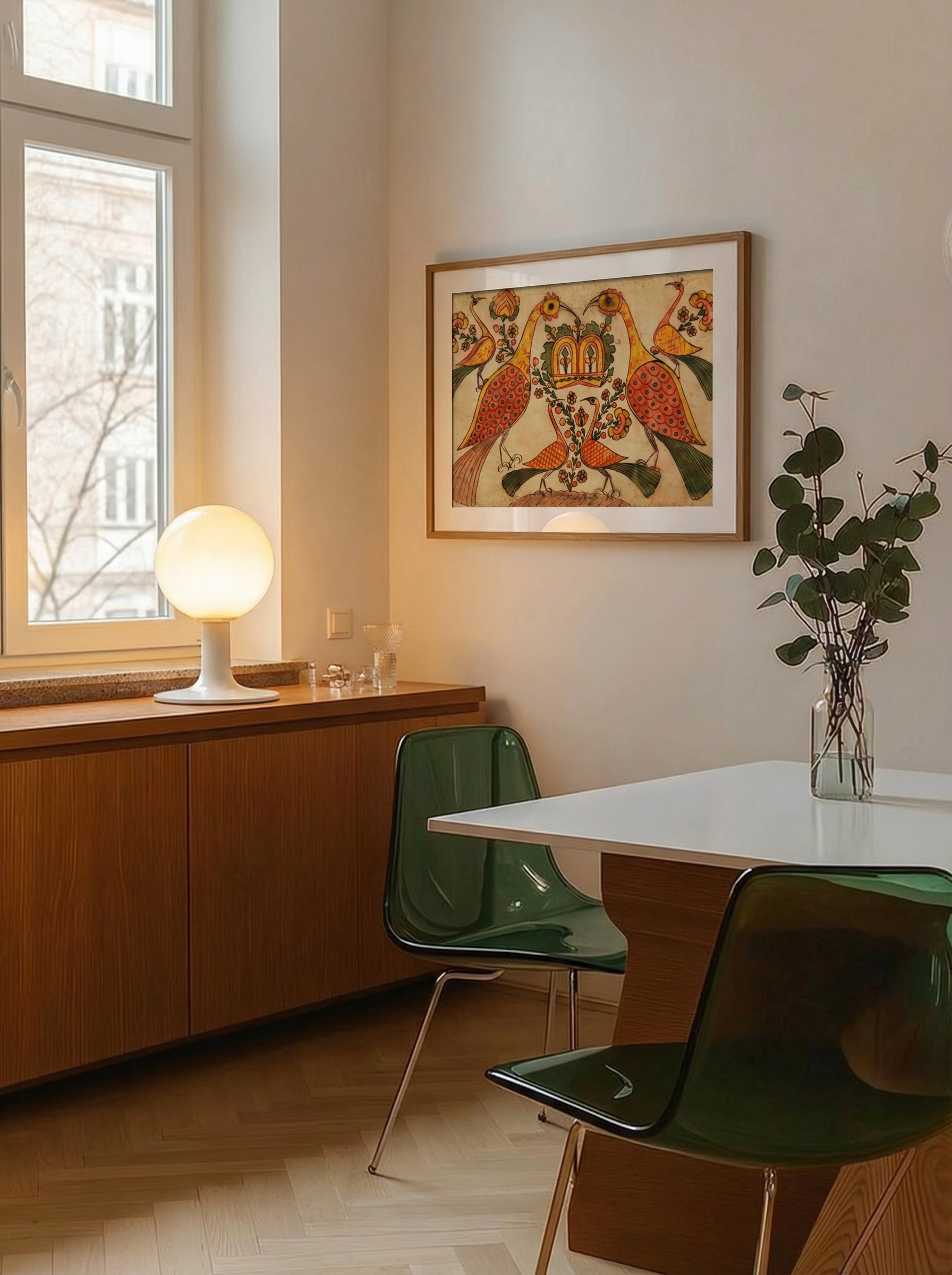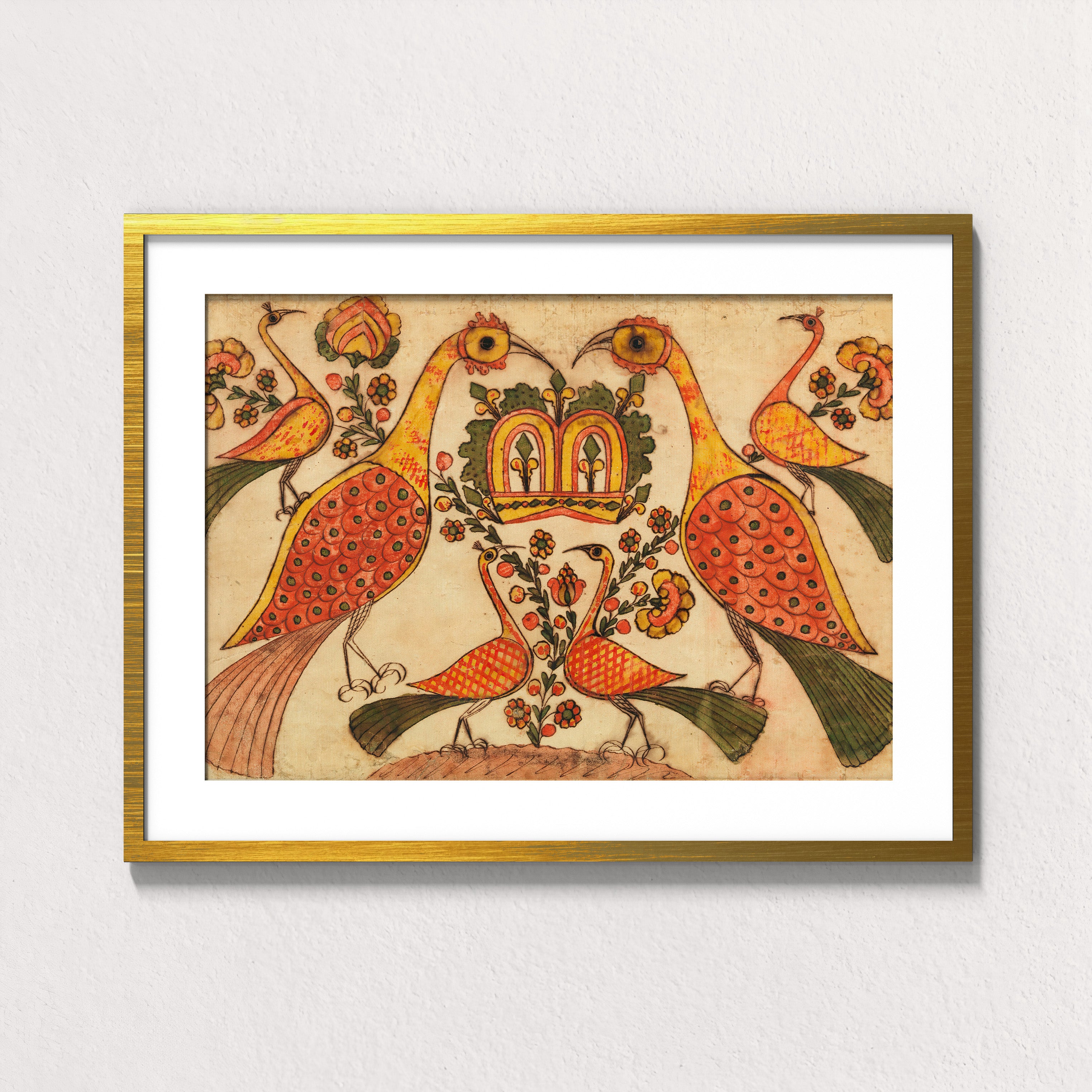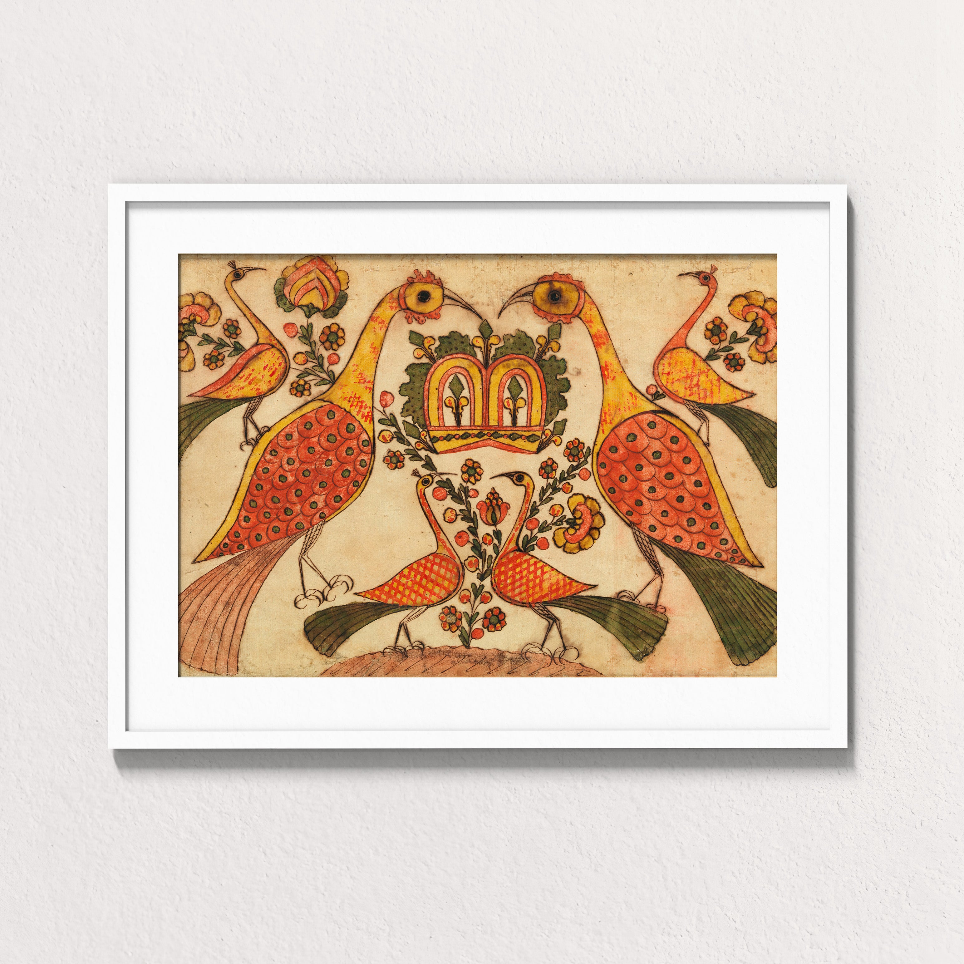 Crowned by Balance is a radiant folk composition attributed to Johann Heinrich Otto, drawing from Palampore and Fraktur-inspired motifs that bridged South Indian textile design with European decorative traditions in the 18th century. At its heart, two regal peacocks stand mirrored in perfect symmetry, their long necks curving inward to guard a crowned bloom of foliage and flowers.