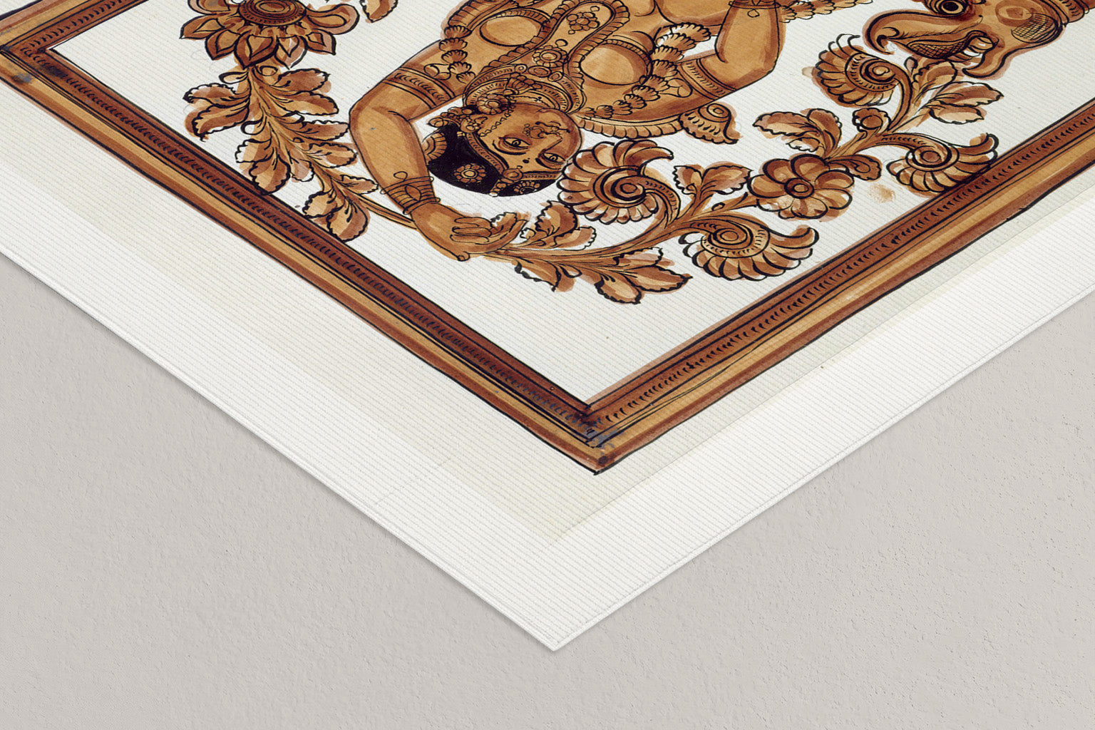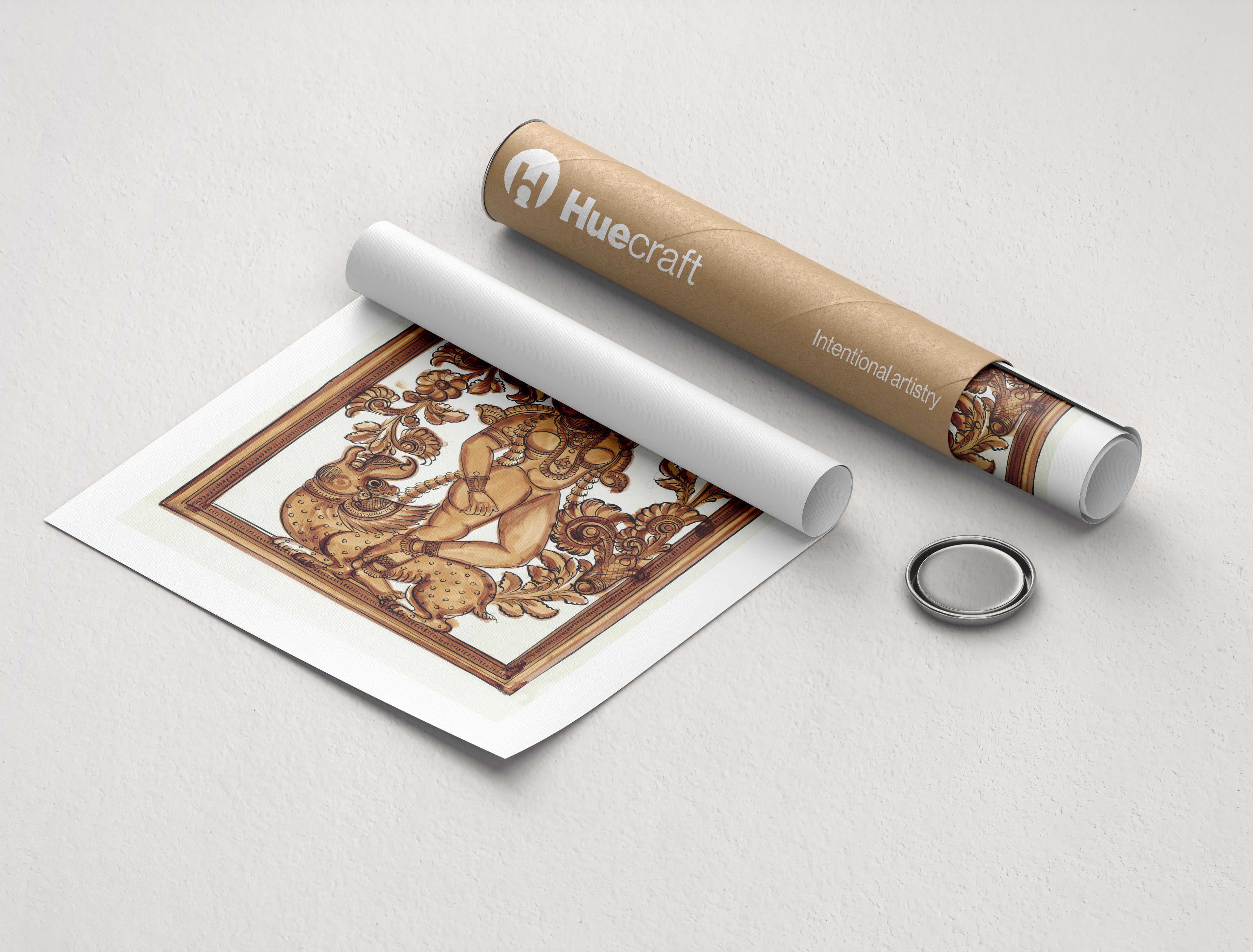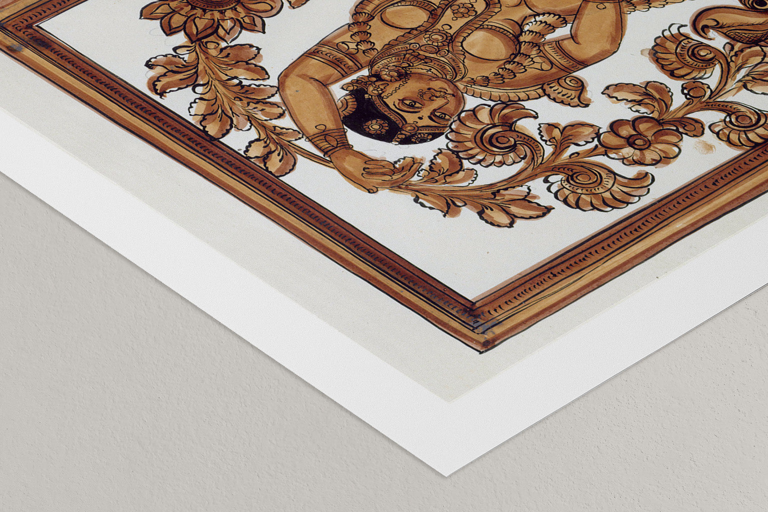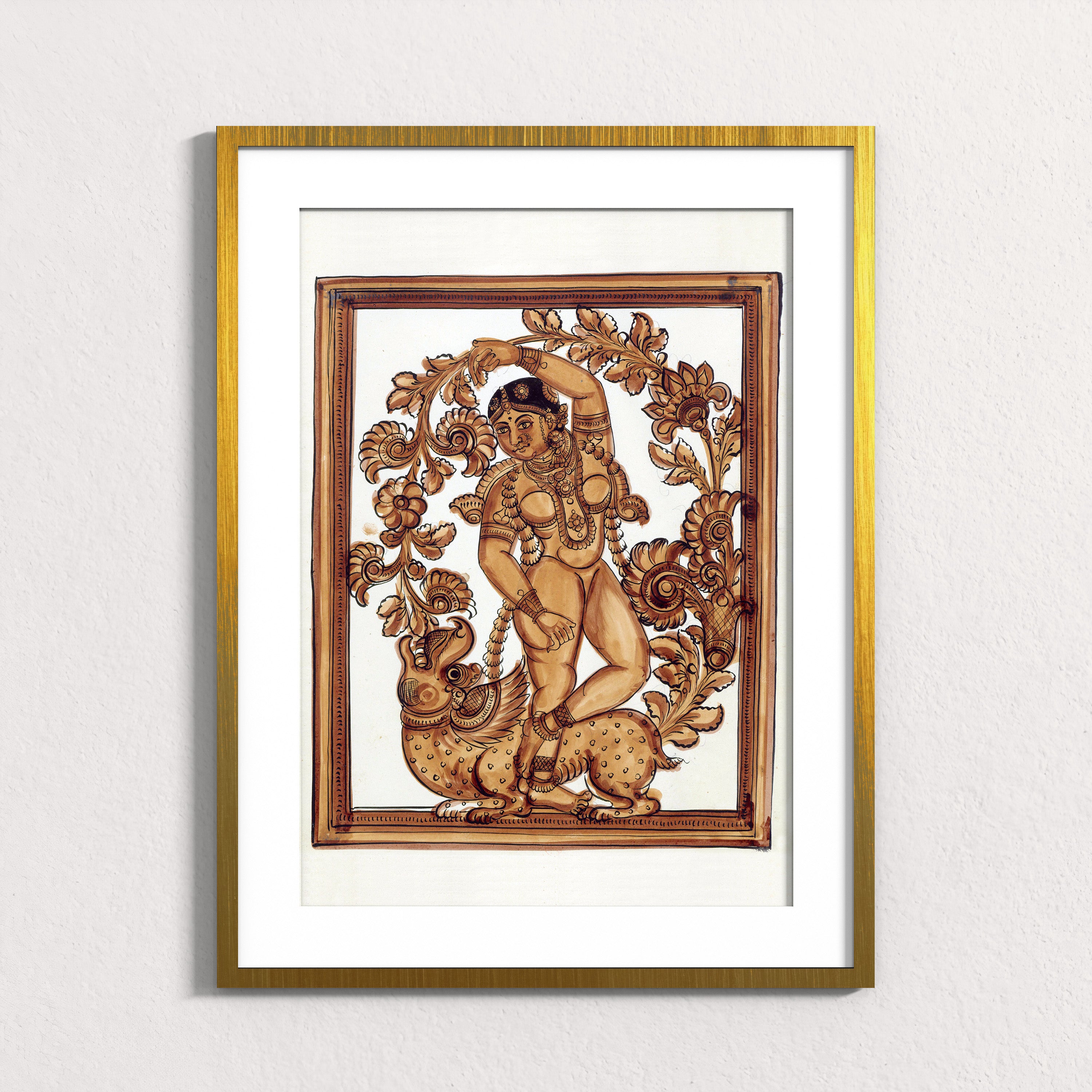 Dancer of the Sacred Yali is a lyrical tribute to movement as devotion. Drawn from the early 19th-century Chidambaram shrine painting series, this exquisite archival artwork captures a dancer poised atop a Yali, the mythical lion-elephant guardian of Tamil temples. Her body curves in mid-motion, suspended between grace and strength, as if sculpture itself has learned to breathe.