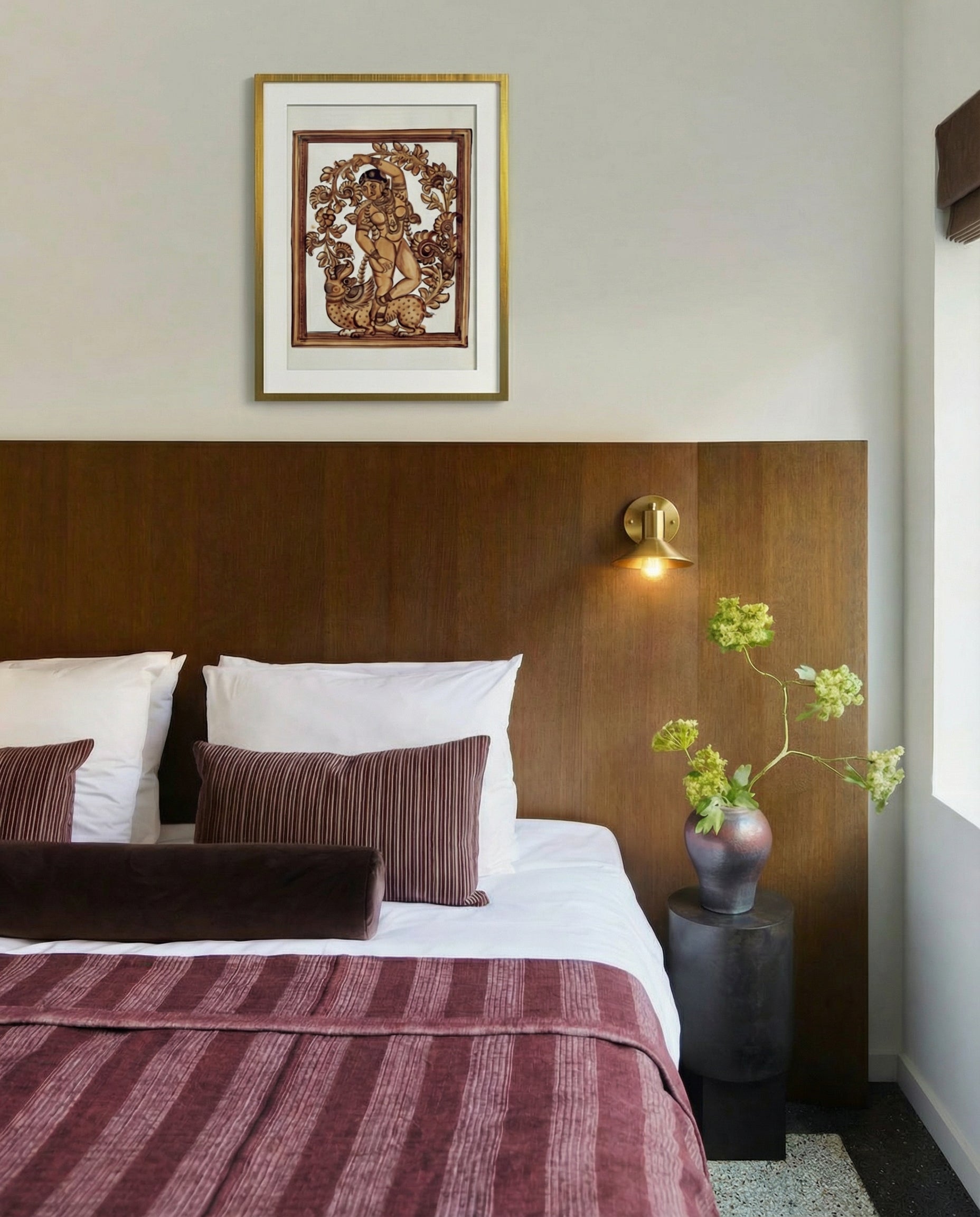Rendered in sepia ink and softened natural pigments, the composition echoes the visual language of temple friezes. Flowing vines and stylized scrollwork frame the figure, creating a rhythmic enclosure that mirrors the dancer’s posture. Every line feels deliberate, yet alive, translating carved stone into fluid gesture.