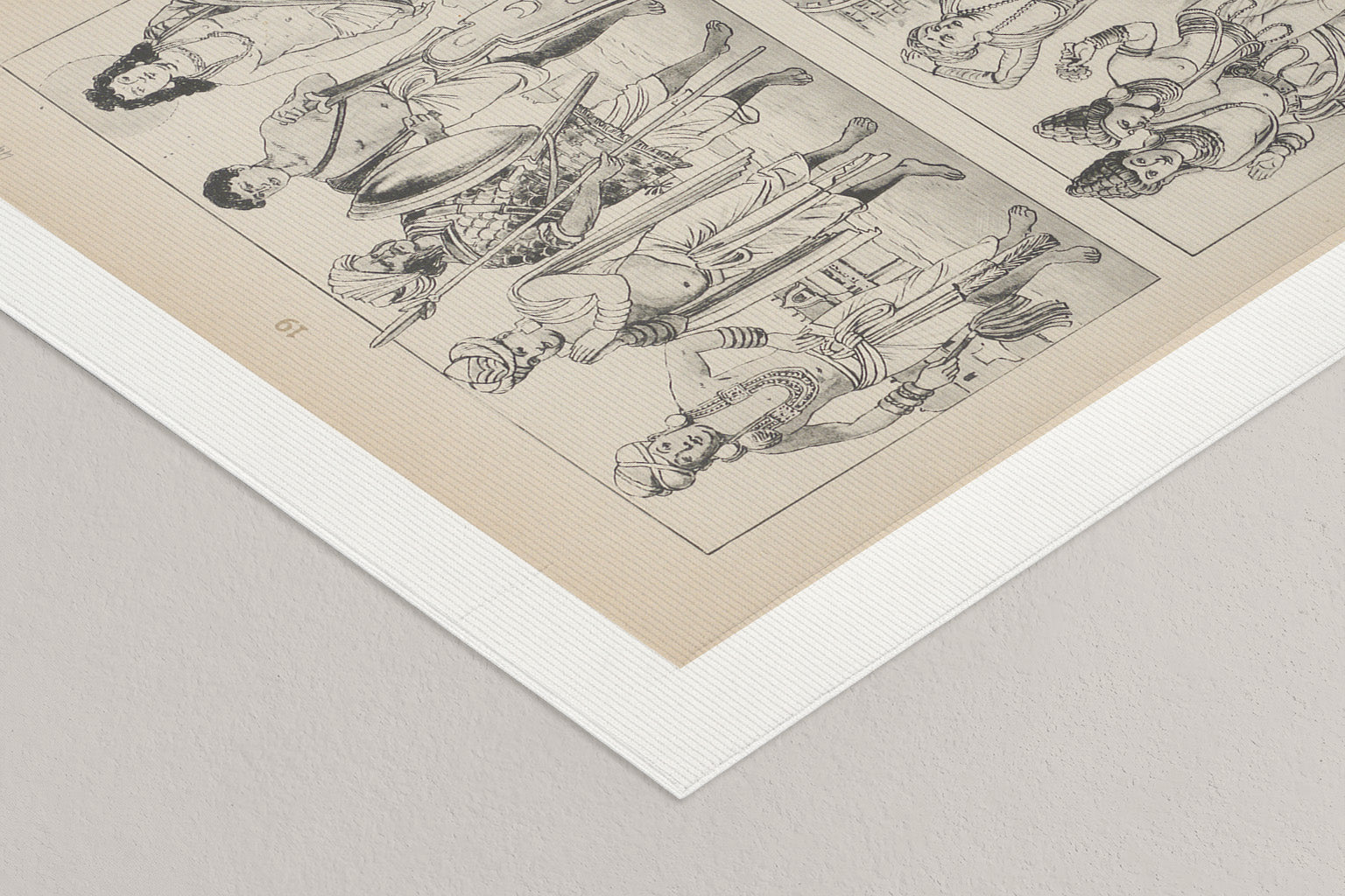 Figures of Ancient India offers a rare visual record of how 19th-century Europe imagined the civilizational depth of the Indian subcontinent. Created in 1905 by German art historian and critic Adolf Rosenberg, this archival print presents a studied procession of men and women from antiquity: scholars wrapped in flowing robes, temple dancers poised in graceful contrapposto, warriors bearing arms, and ascetics standing in quiet restraint.