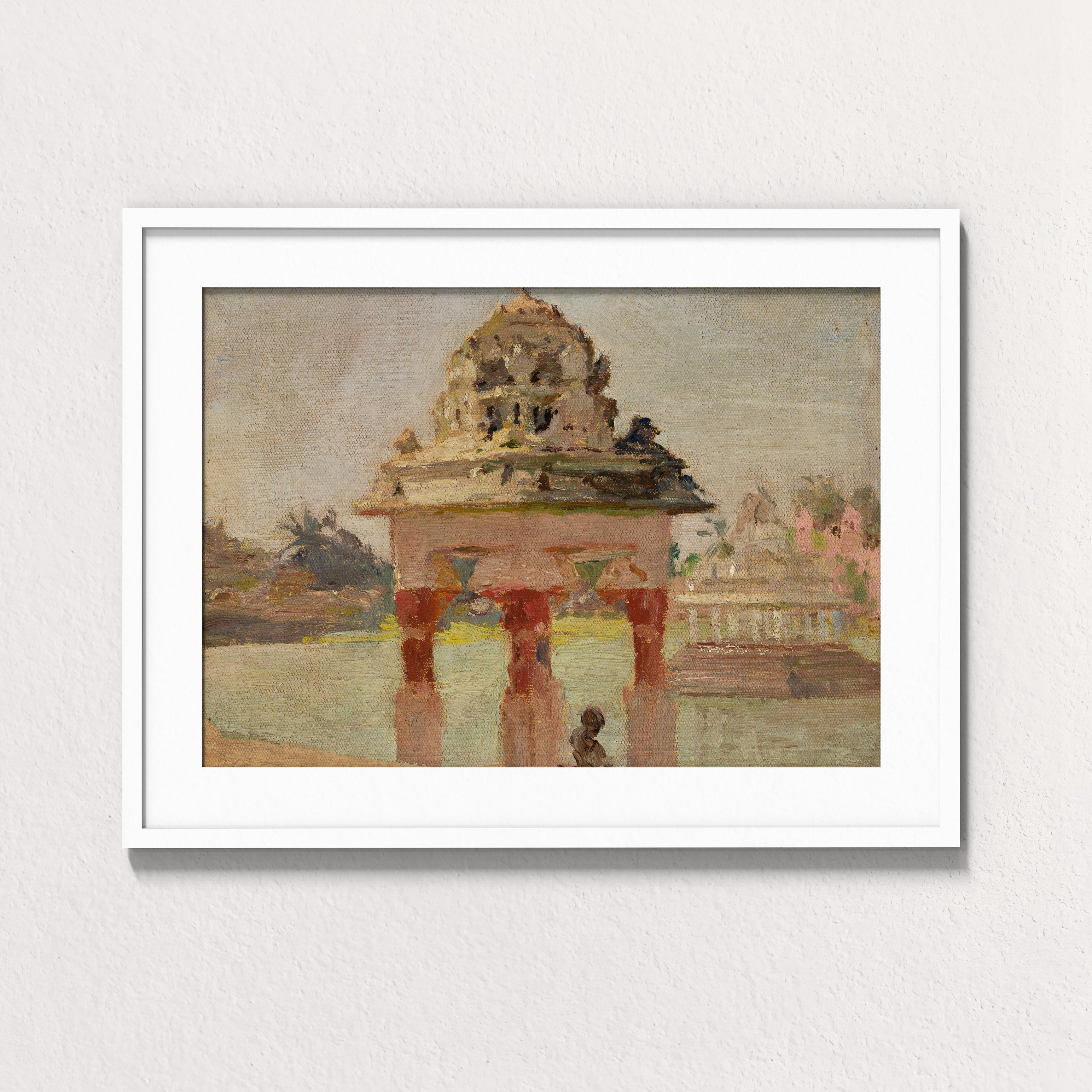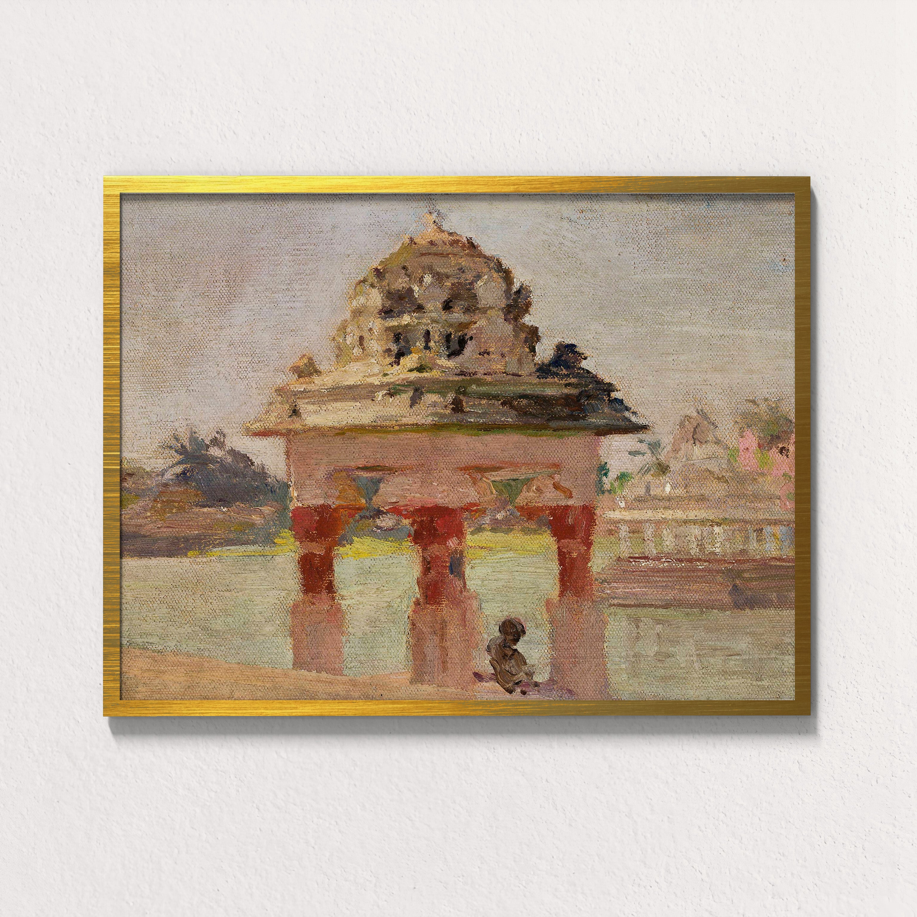Gopuram by the Sacred Pond captures the quiet dialogue between monument and moment, scale and soul. Painted in 1907 by Polish artist Jan Ciągliński during his journey through India, this luminous study presents a Tamil temple rising gently from the edge of a holy water tank, its reflection trembling in pale, sunlit stillness.