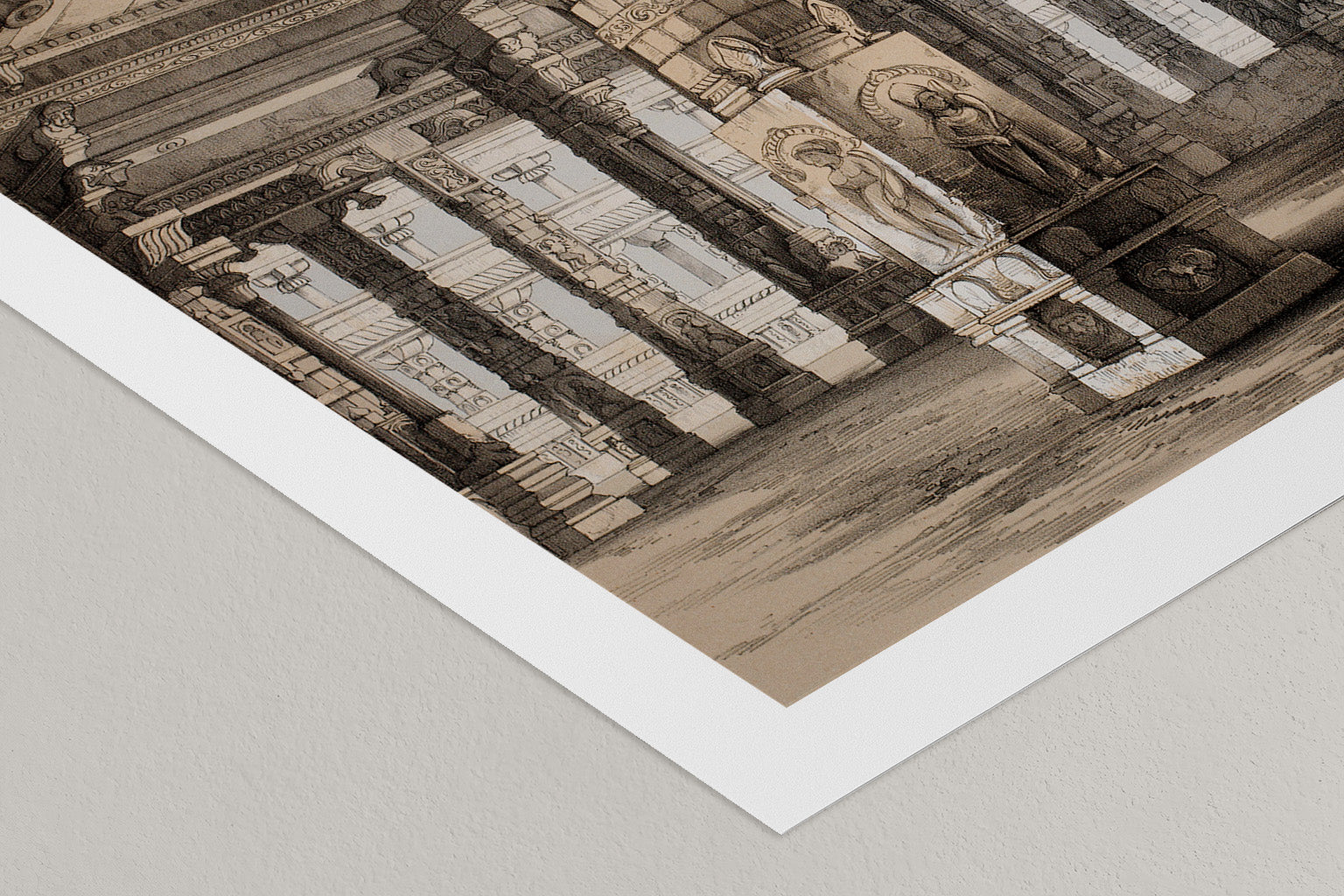Fergusson’s disciplined line work reflects the analytical eye of a 19th century architectural historian, yet the result transcends documentation. The sepia palette softens the geometry, allowing the mandapam to feel lived in rather than monumental. The space breathes, offering a moment of pause within stone.