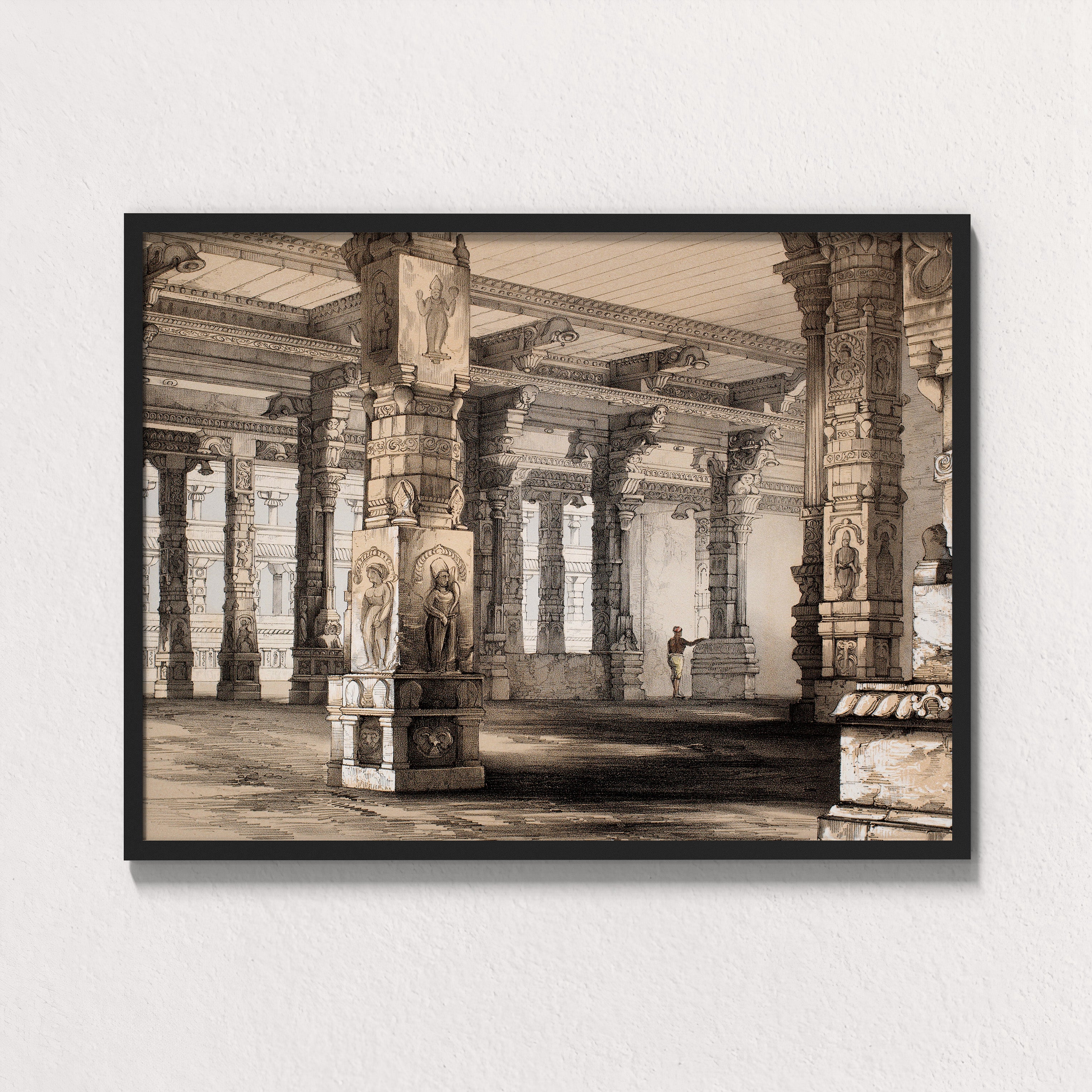 Hall of Stillness, Chidambaram invites the viewer into a space where indicate silence becomes form. This refined lithograph by James Fergusson presents the mandapam of Parvati’s shrine within the sacred Nataraja Temple at Chidambaram, one of Tamil Nadu’s most revered Shaivite complexes.