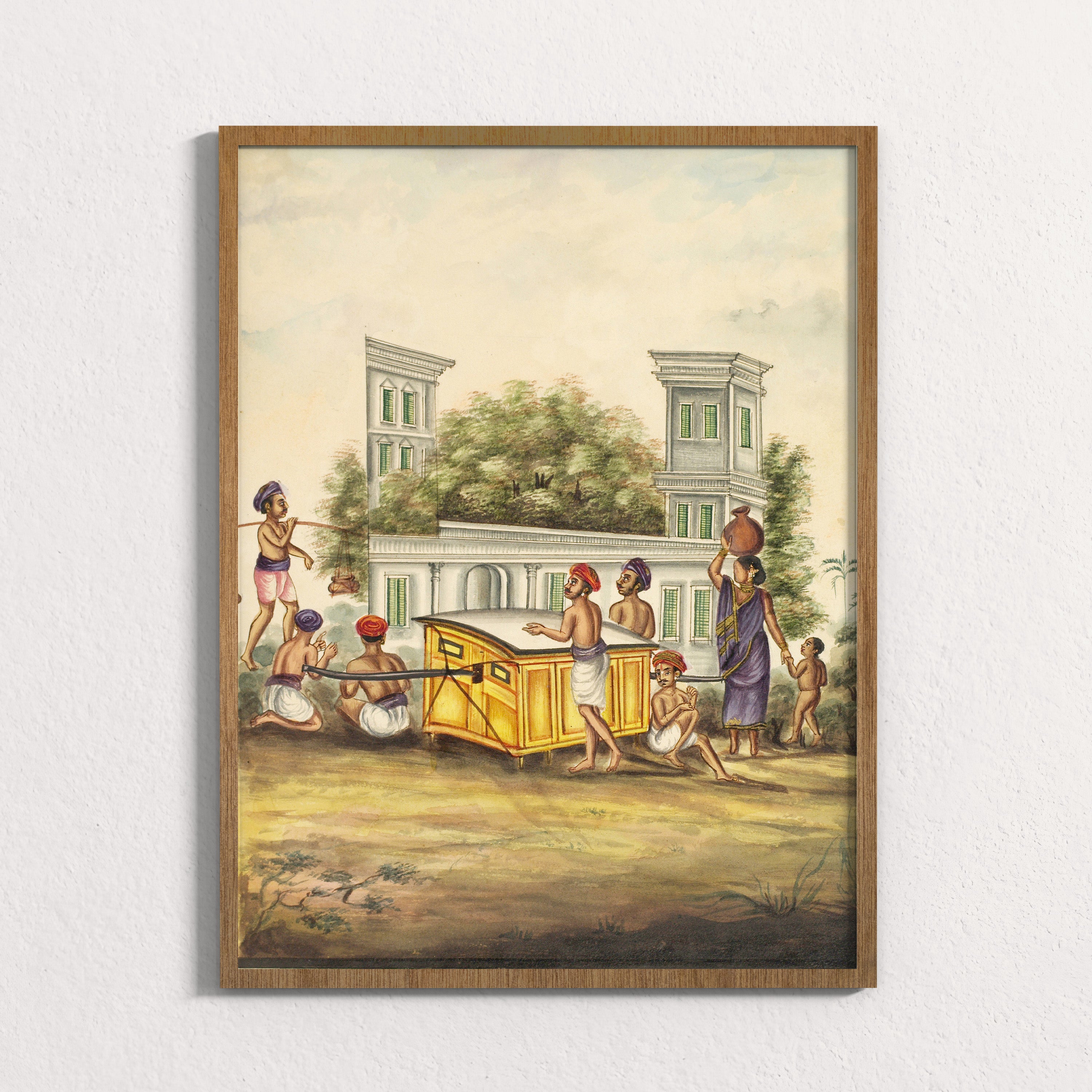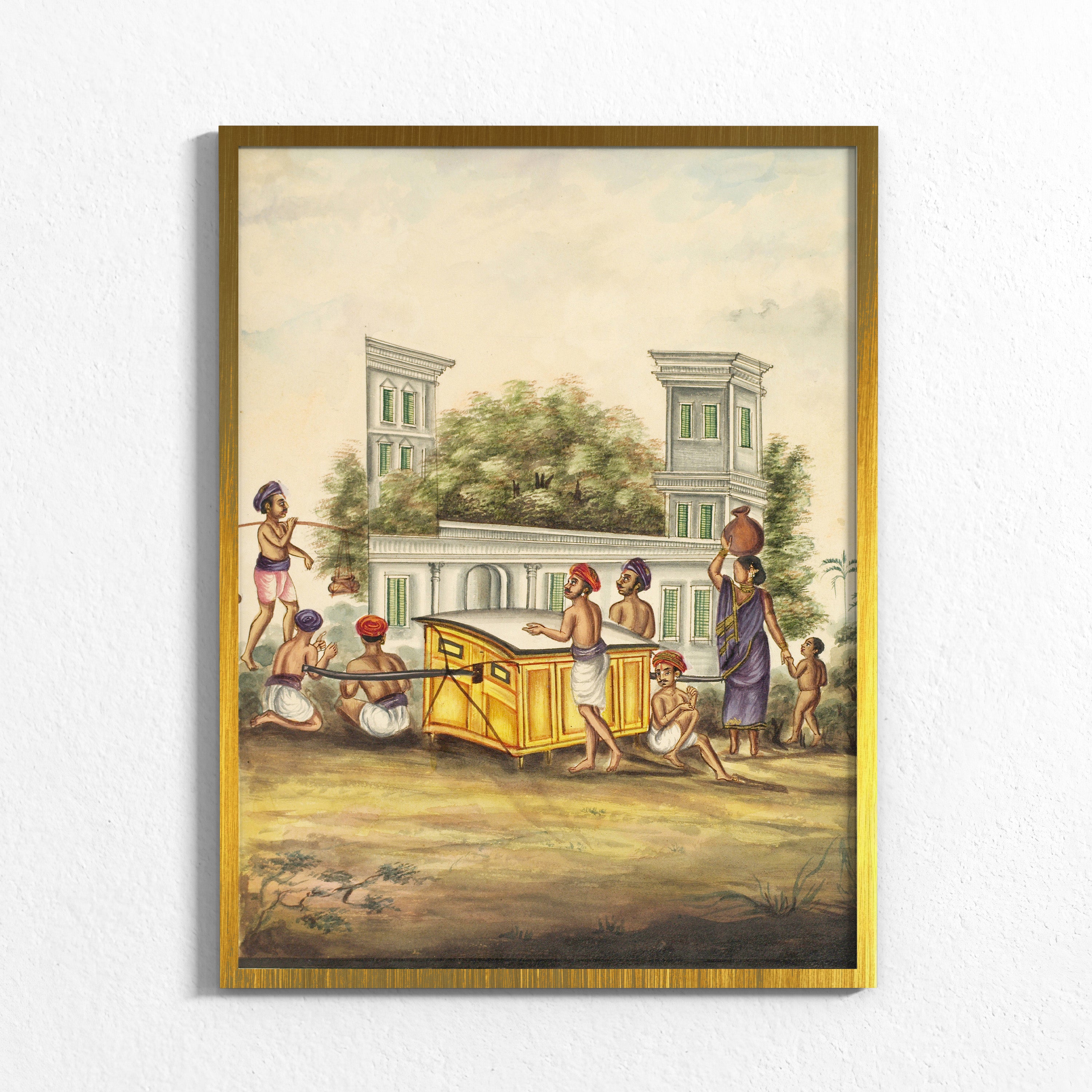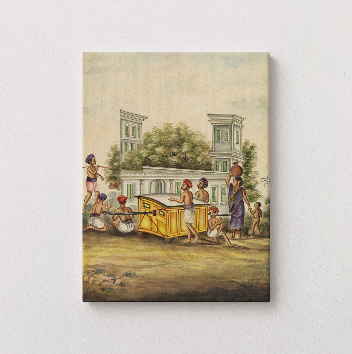 At the center, a palanquin is carried with careful coordination, its weight distributed across many bodies. Around it, figures move with quiet intention. A woman balances a water pot, a child follows barefoot, attendants steady the structure, while others pause or prepare. Behind them rises a colonial façade, softened by trees, suggesting a town where older rhythms of life continued alongside new political realities.