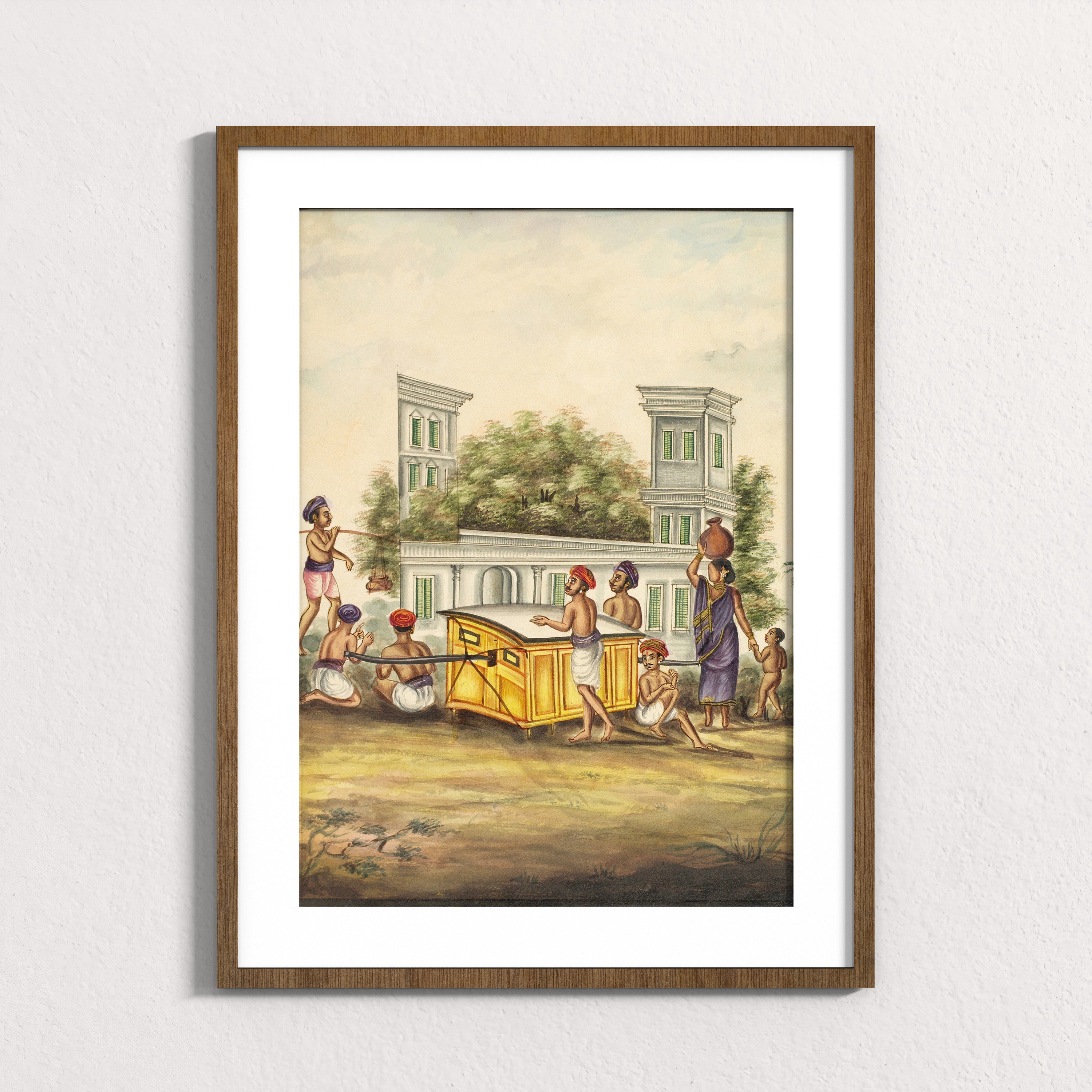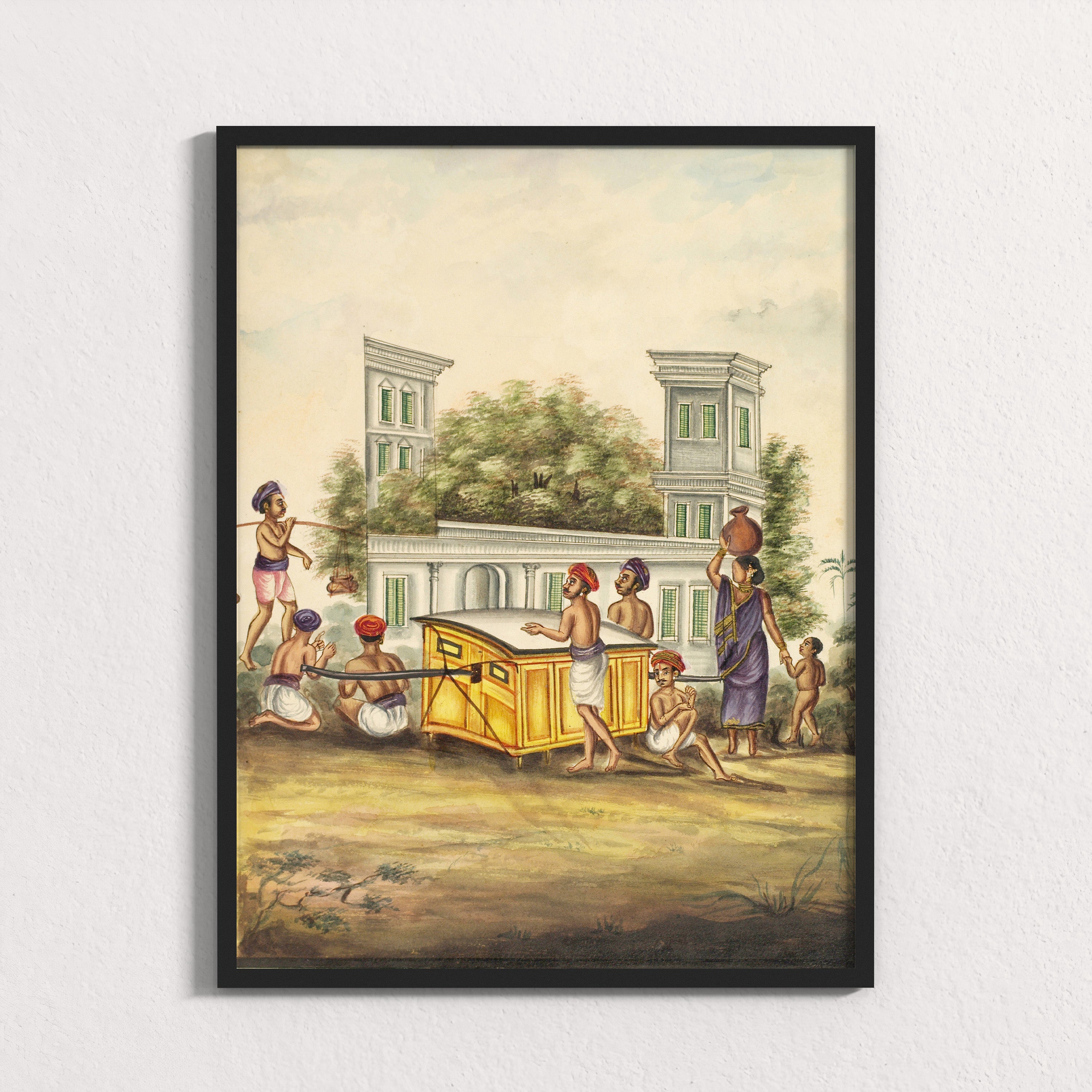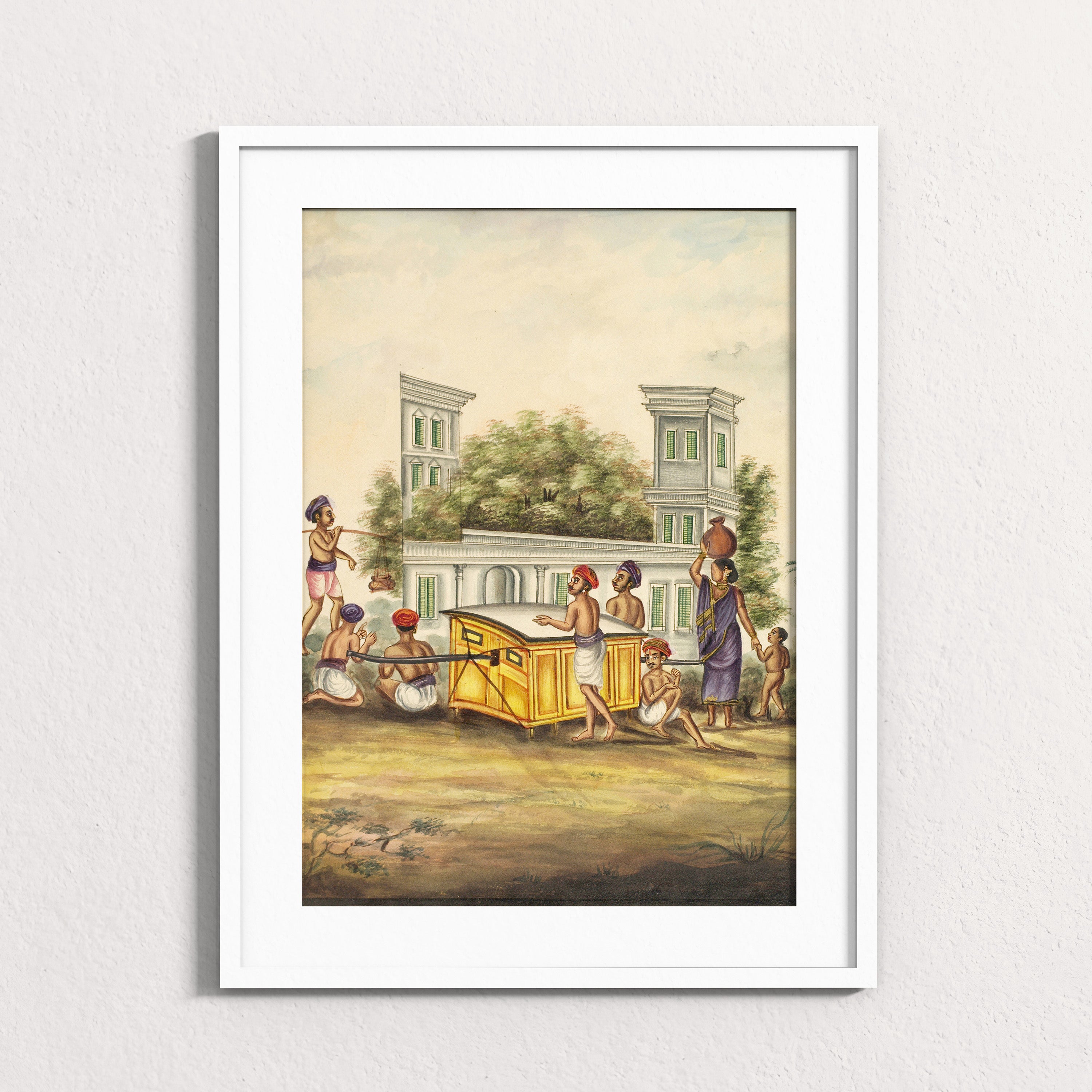 At the center, a palanquin is carried with careful coordination, its weight distributed across many bodies. Around it, figures move with quiet intention. A woman balances a water pot, a child follows barefoot, attendants steady the structure, while others pause or prepare. Behind them rises a colonial façade, softened by trees, suggesting a town where older rhythms of life continued alongside new political realities.