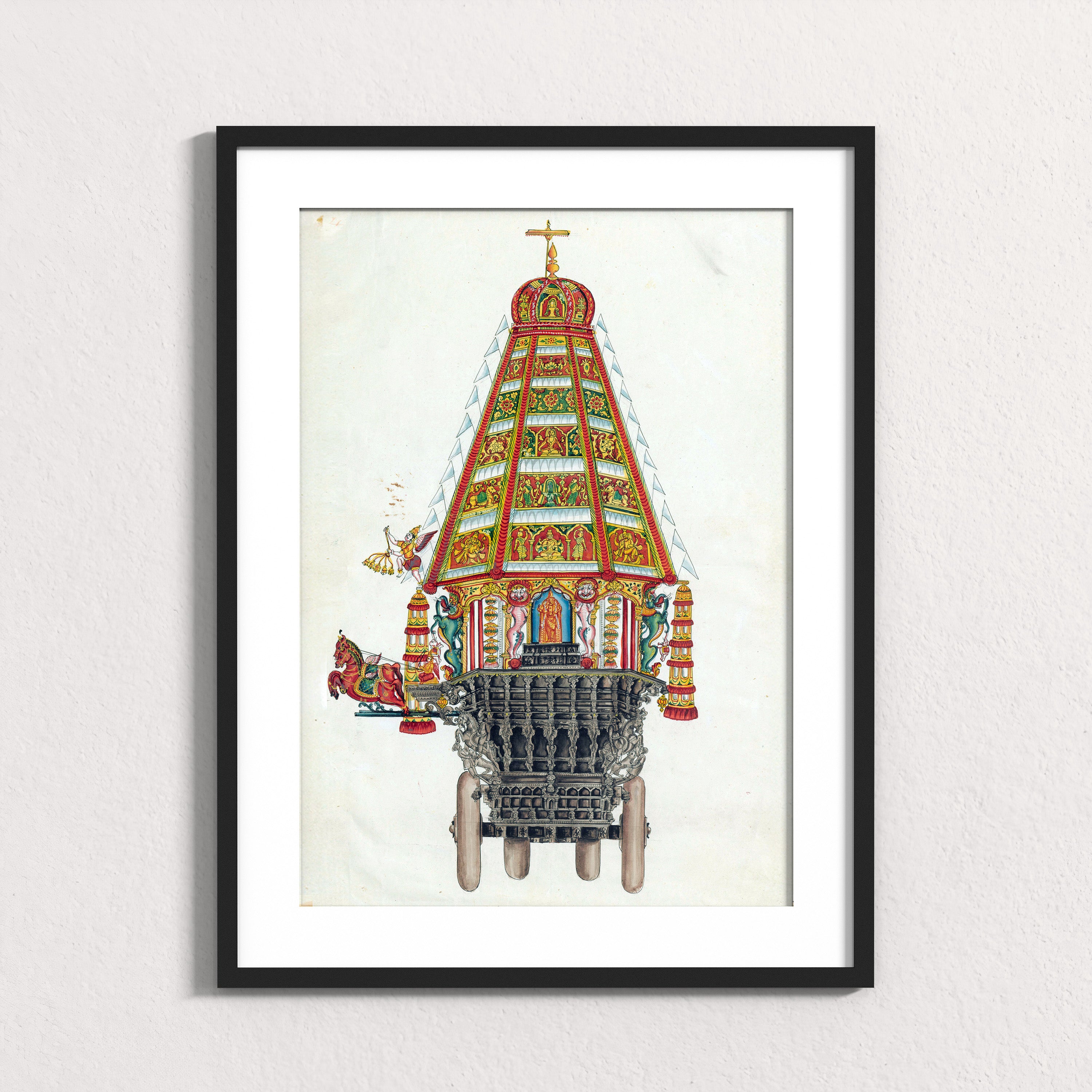 The Sacred Chariot of Thanjavur captures one of South India’s most awe-inspiring sights: the towering temple chariot set in motion through the streets, carrying divinity into the everyday world. Drawn from the Chidambaram Shrine painting series of the early 19th century, this richly detailed archival lithograph preserves a moment when architecture, ritual, and community converged.