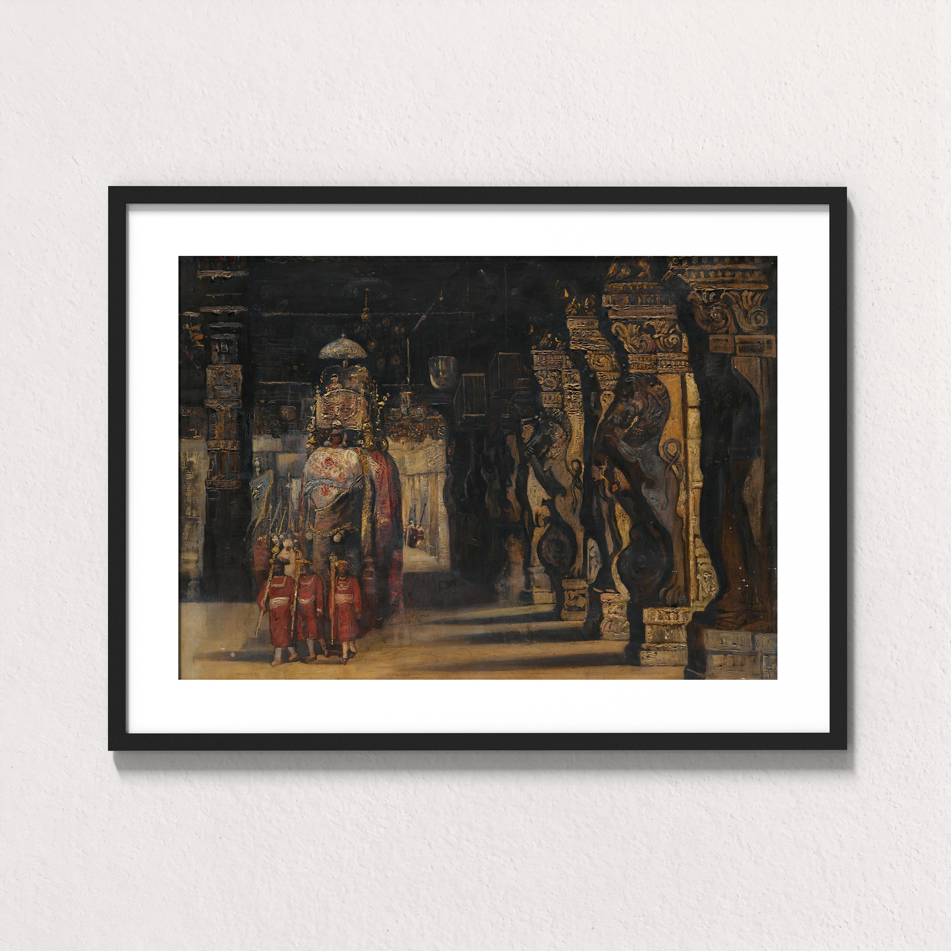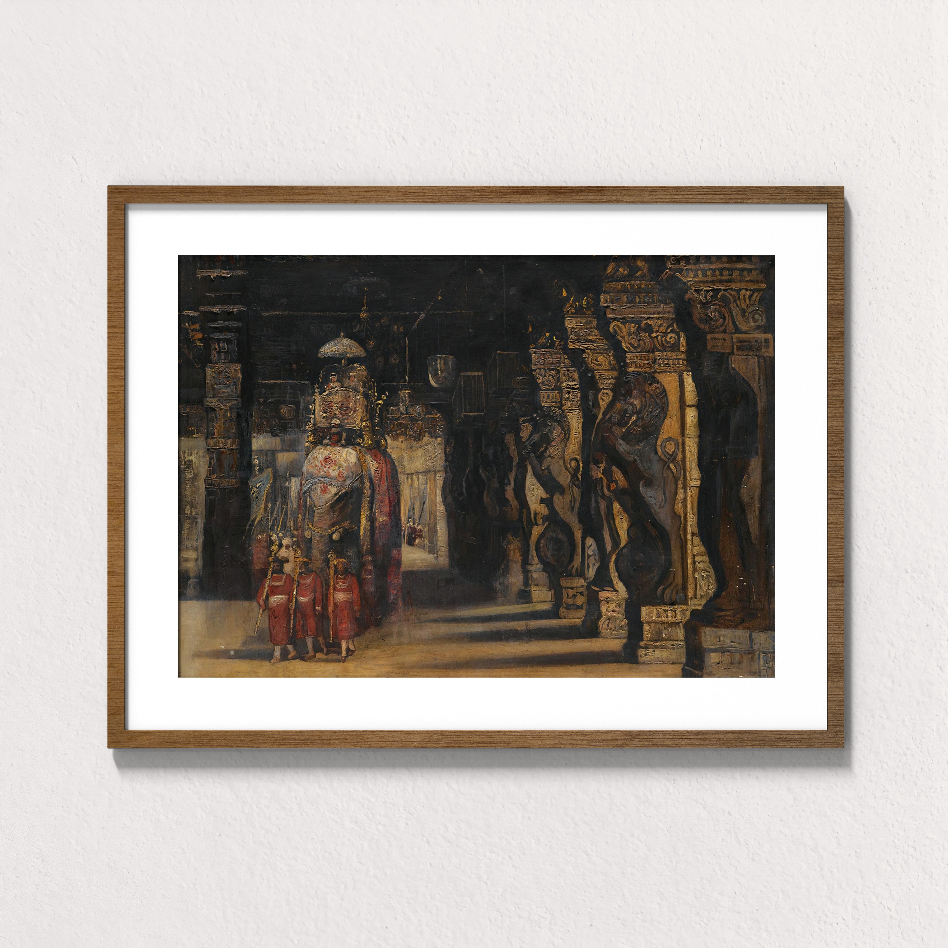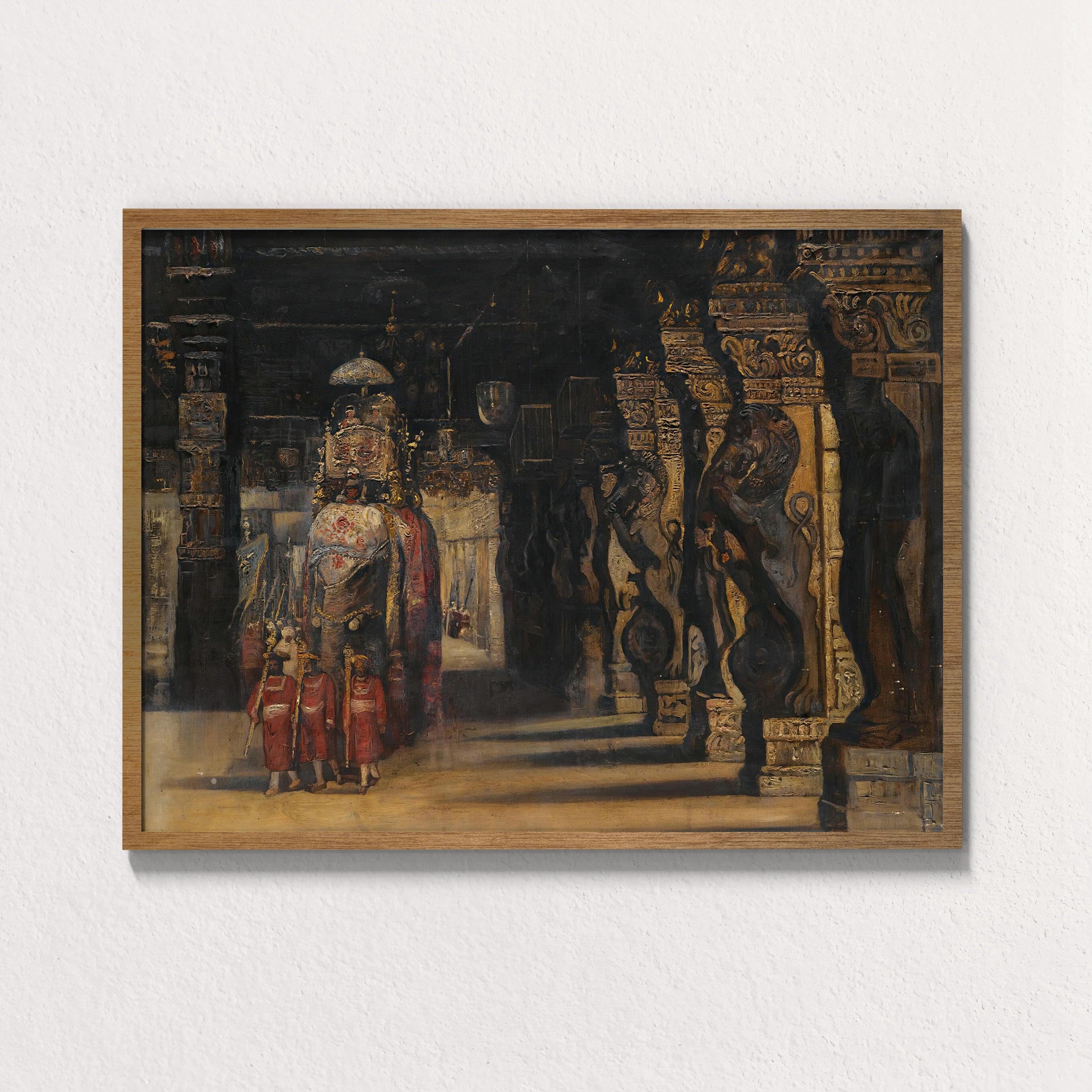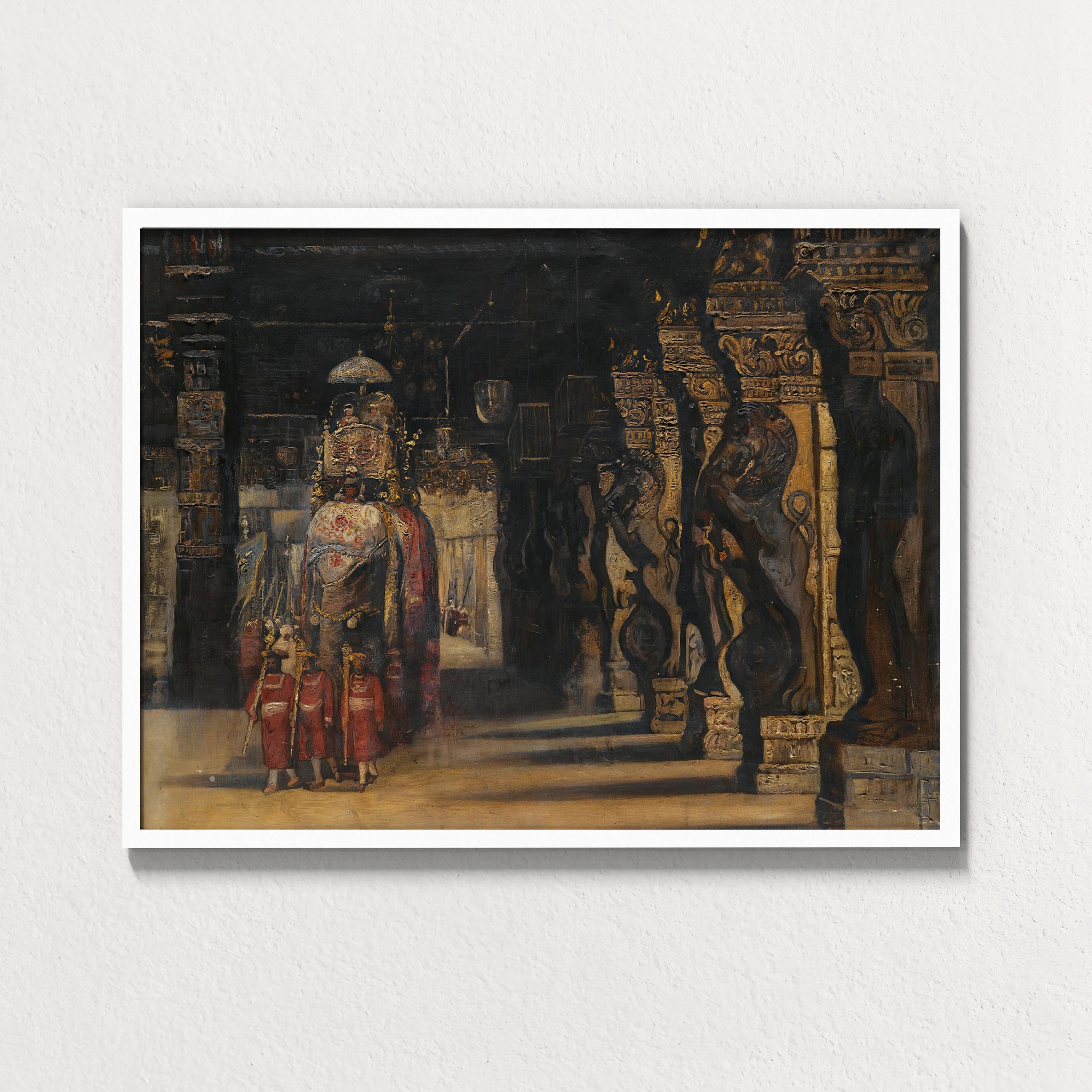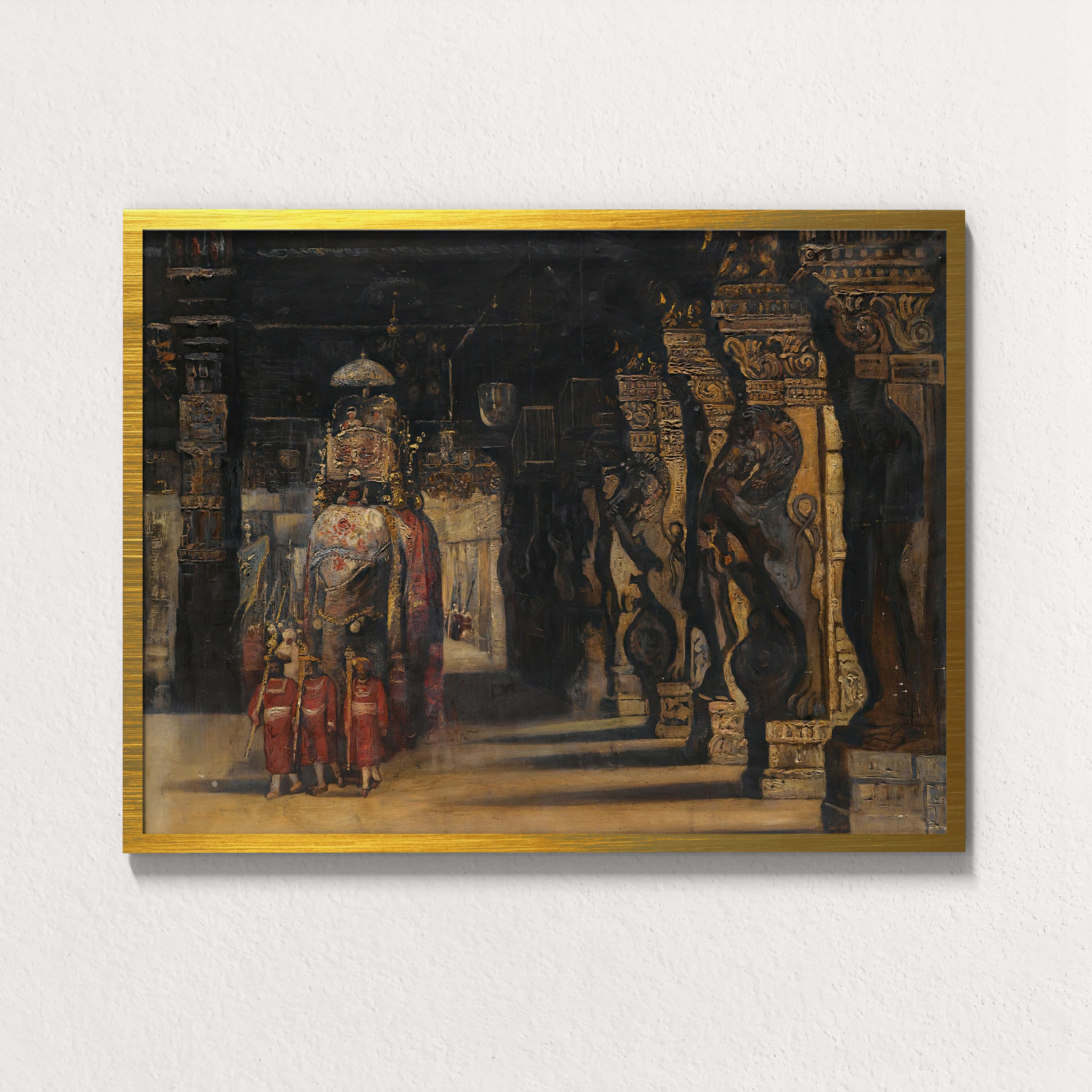 Painted by Hungarian Orientalist artist Gyula Tornai after his early 20th-century travels through Southern India, this artwork is not a literal record but a deeply felt interpretation. Tornai absorbs the rhythm of the Meenakshi Temple and the Nayak-era corridors of Madurai, translating sound, shadow, reverence, and movement into paint. The result is a rare cross-cultural vision, where a European eye encounters Tamil sacred space with humility and wonder.