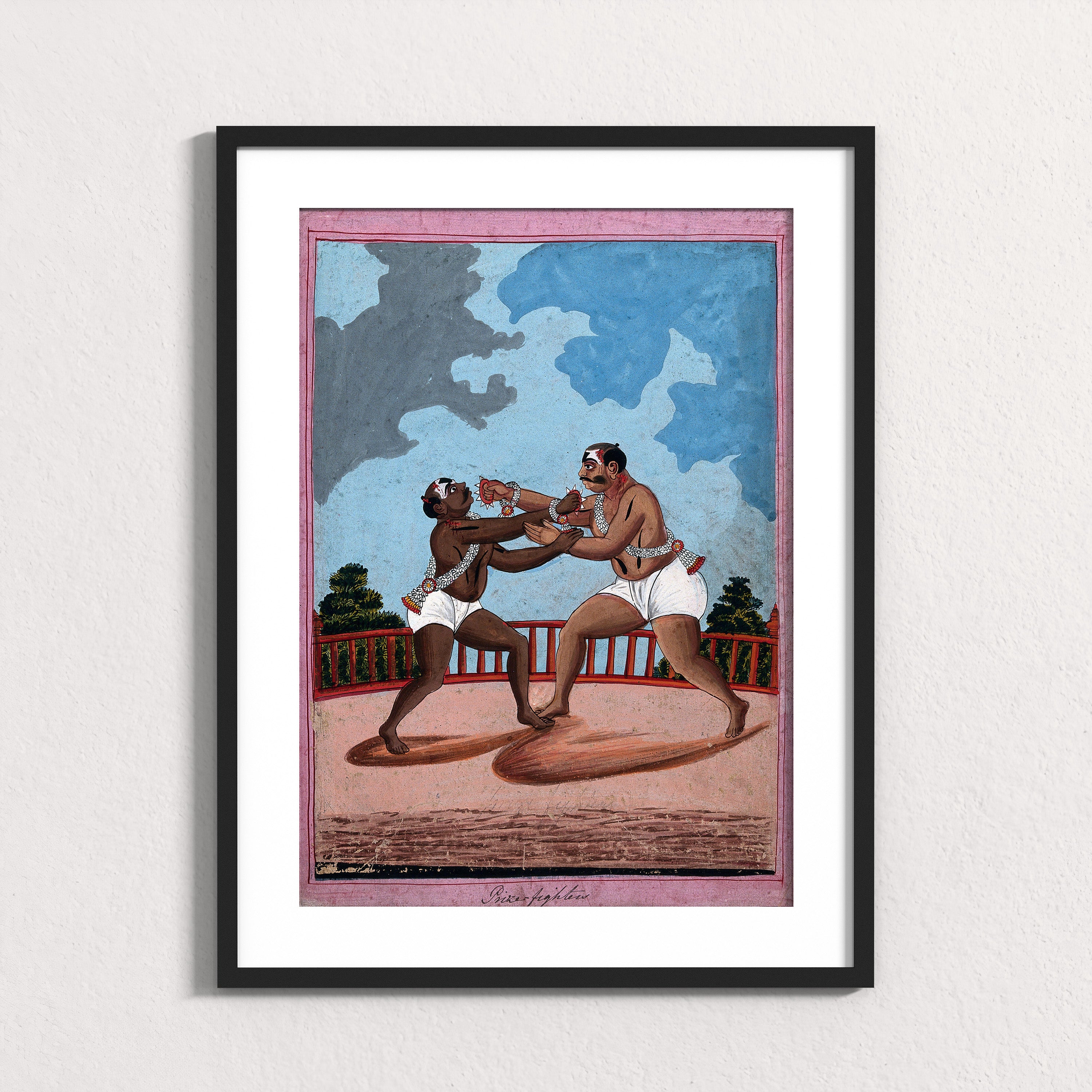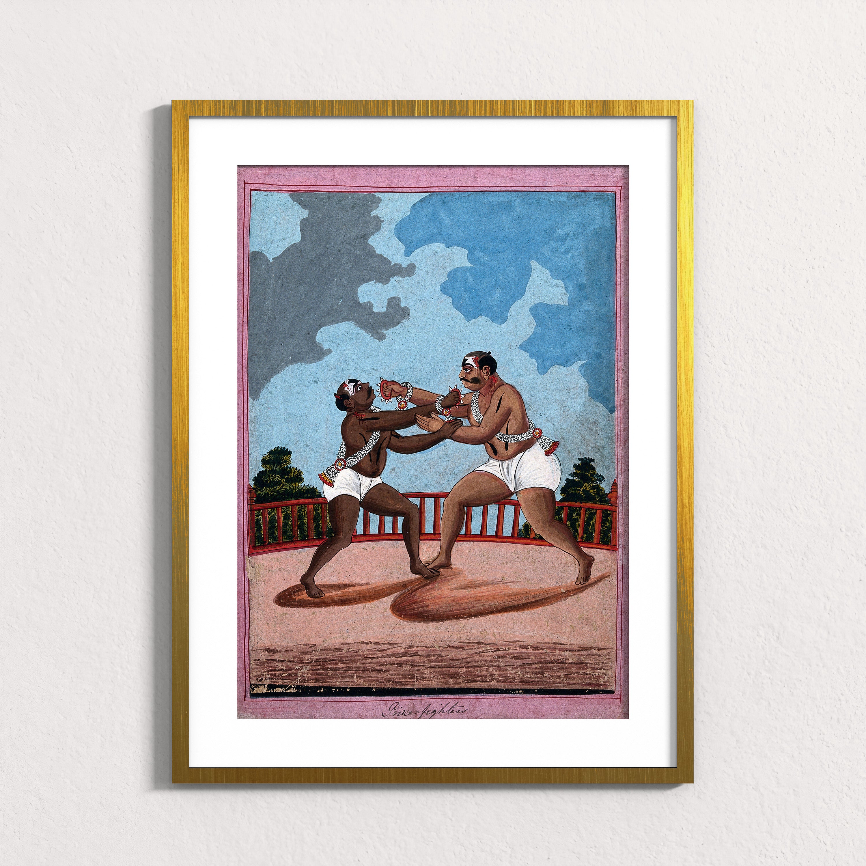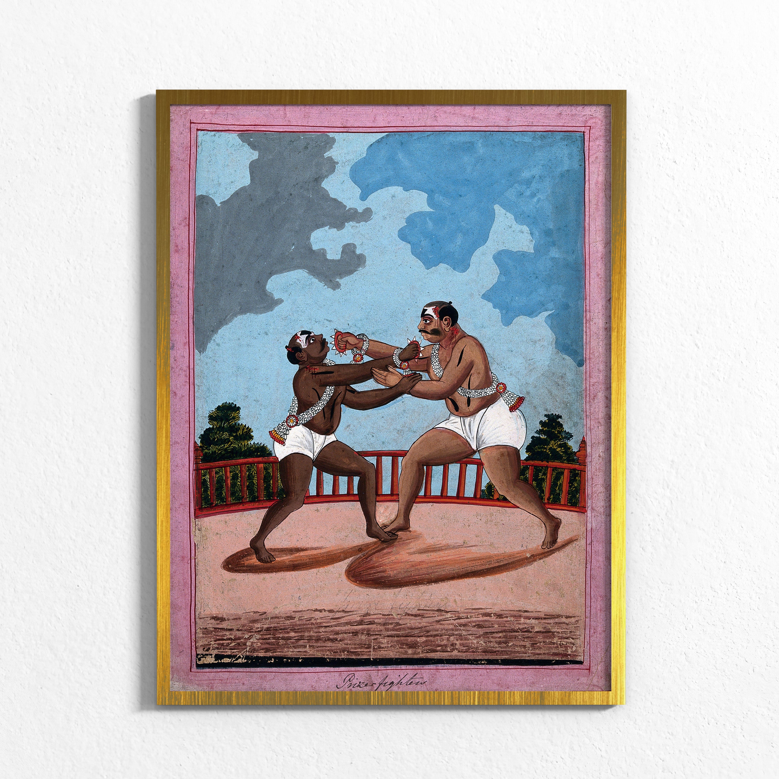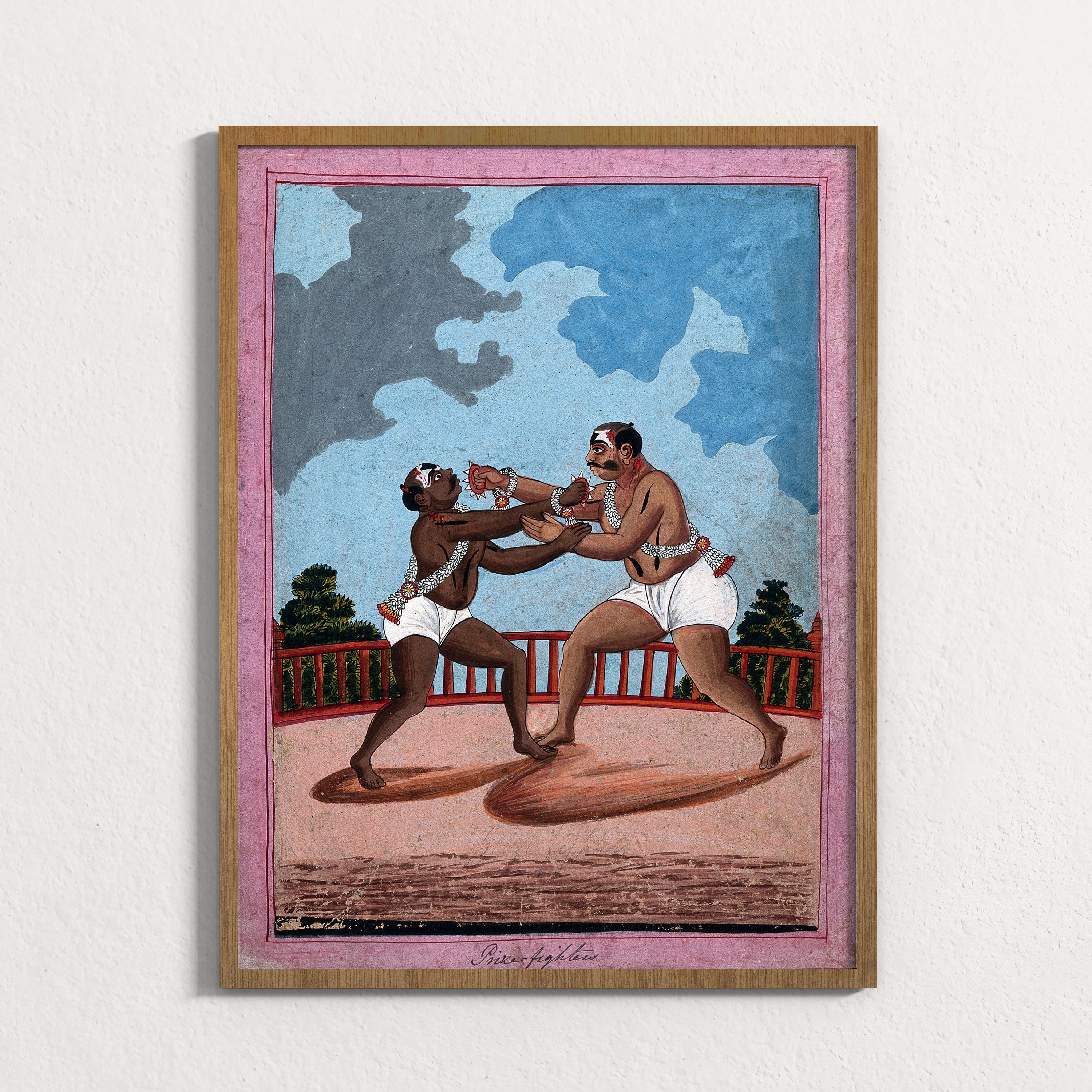 Rooted in South Indian and Maratha court culture, such wrestlers often performed during temple festivals, royal durbars, and ceremonial occasions. From Madurai to Thanjavur, akharas functioned as spaces where masculinity was shaped through humility, endurance, and loyalty. The Company School style preserves this indigenous tradition through careful observation, blending ethnographic intent with painterly rhythm.