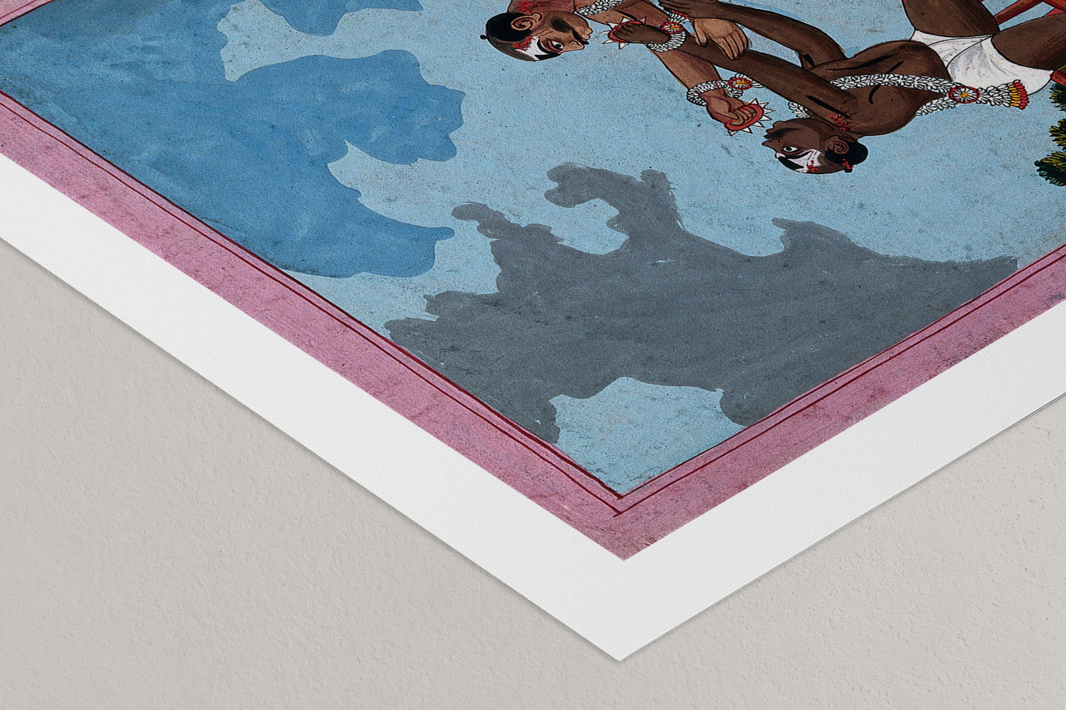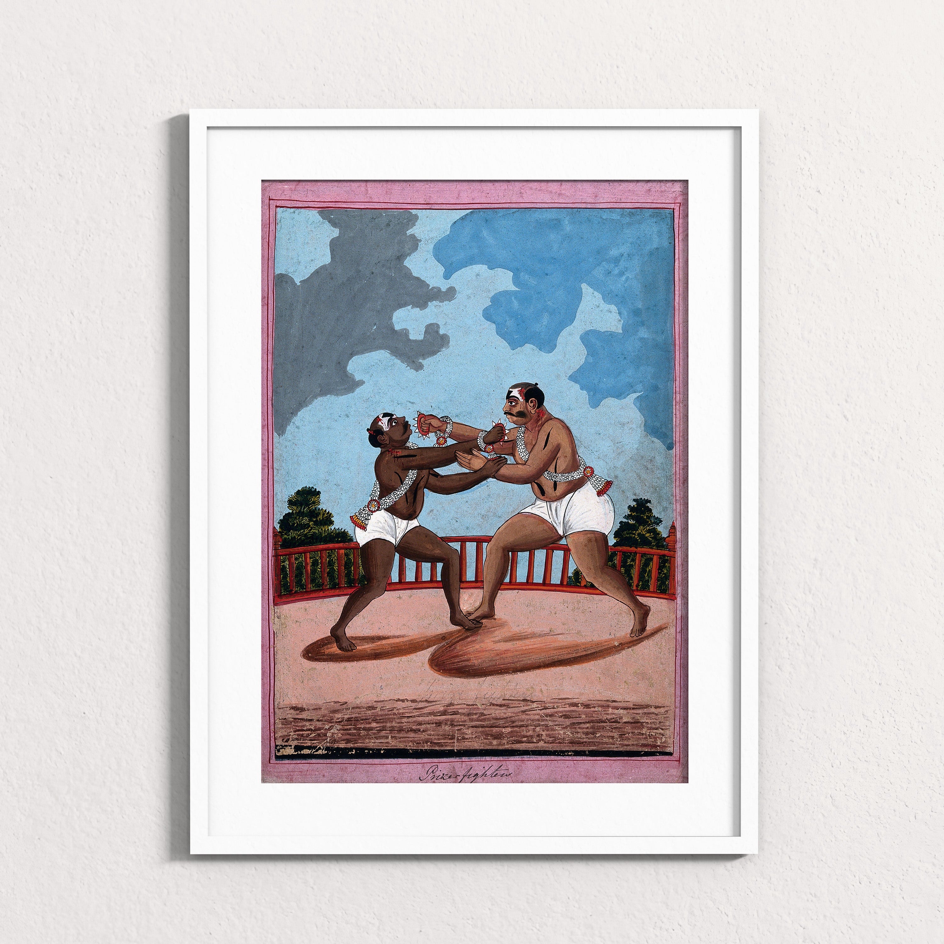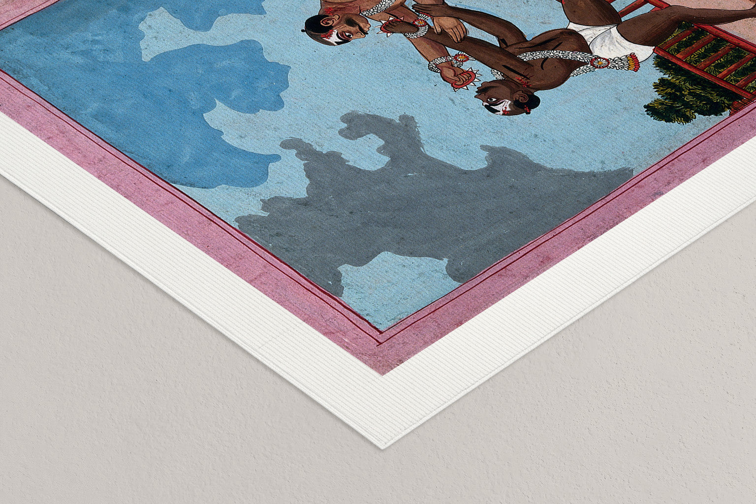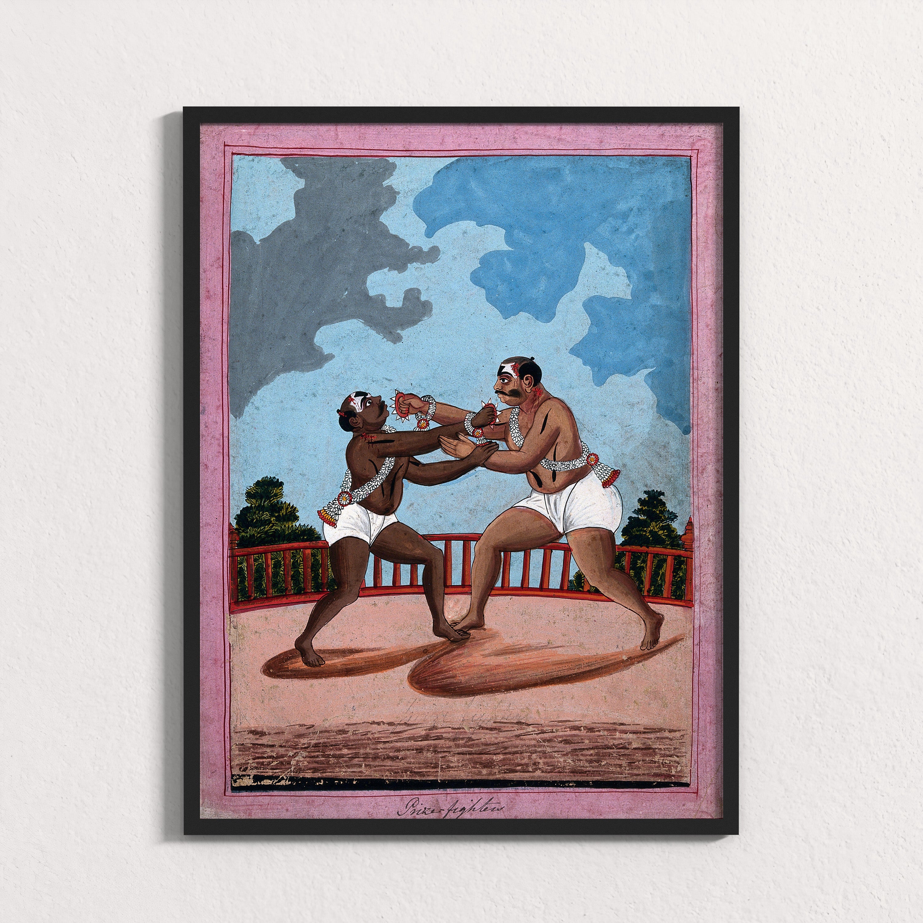 Rooted in South Indian and Maratha court culture, such wrestlers often performed during temple festivals, royal durbars, and ceremonial occasions. From Madurai to Thanjavur, akharas functioned as spaces where masculinity was shaped through humility, endurance, and loyalty. The Company School style preserves this indigenous tradition through careful observation, blending ethnographic intent with painterly rhythm.