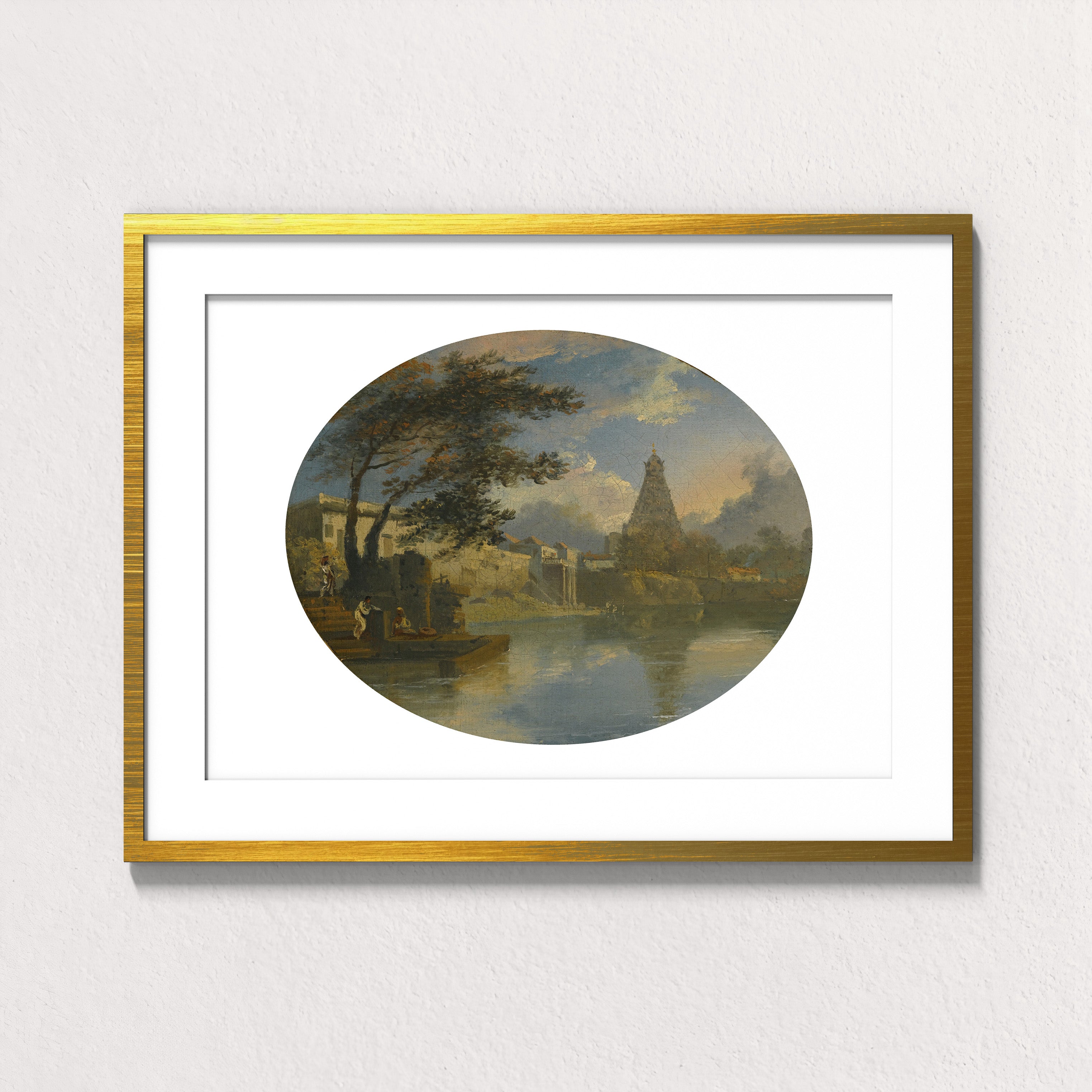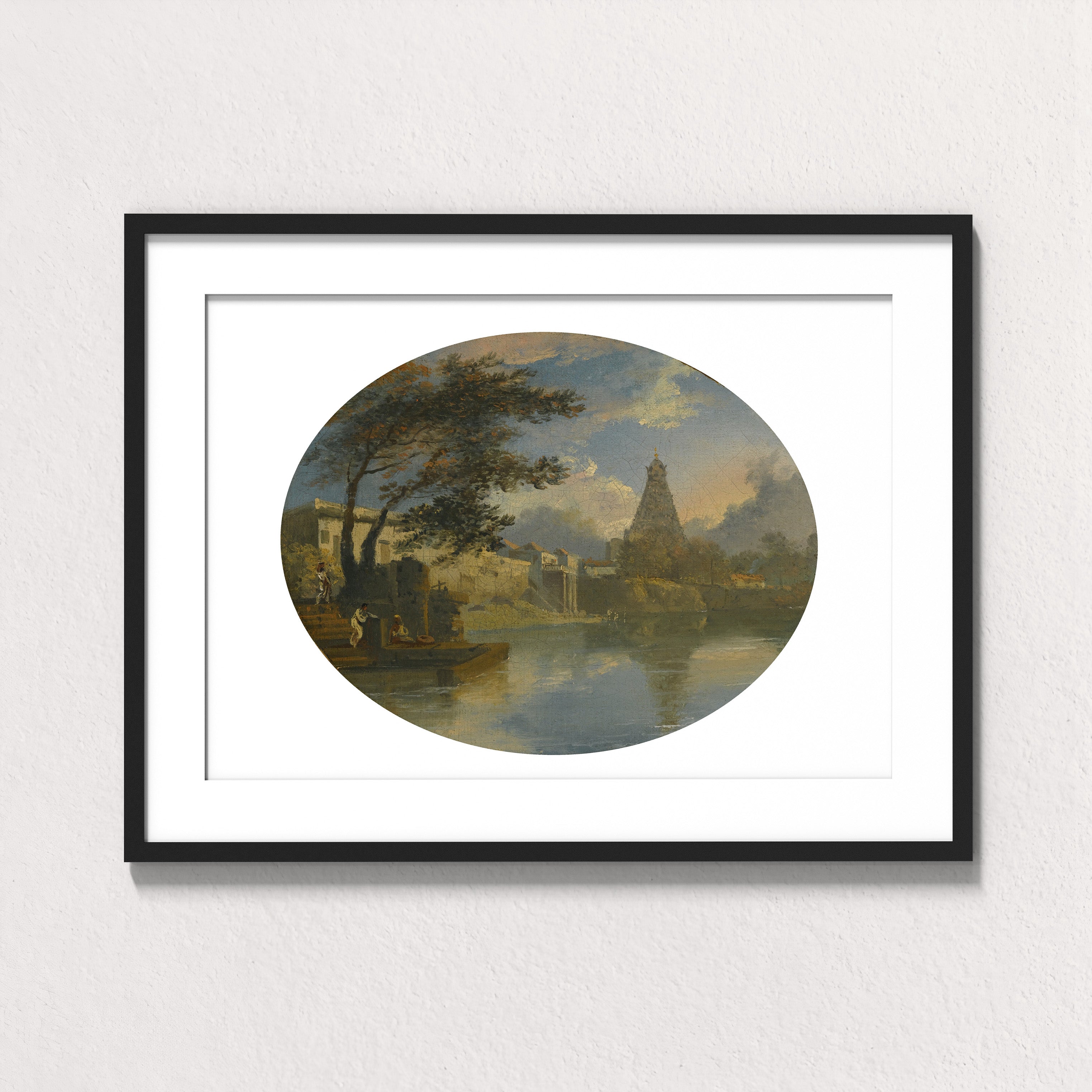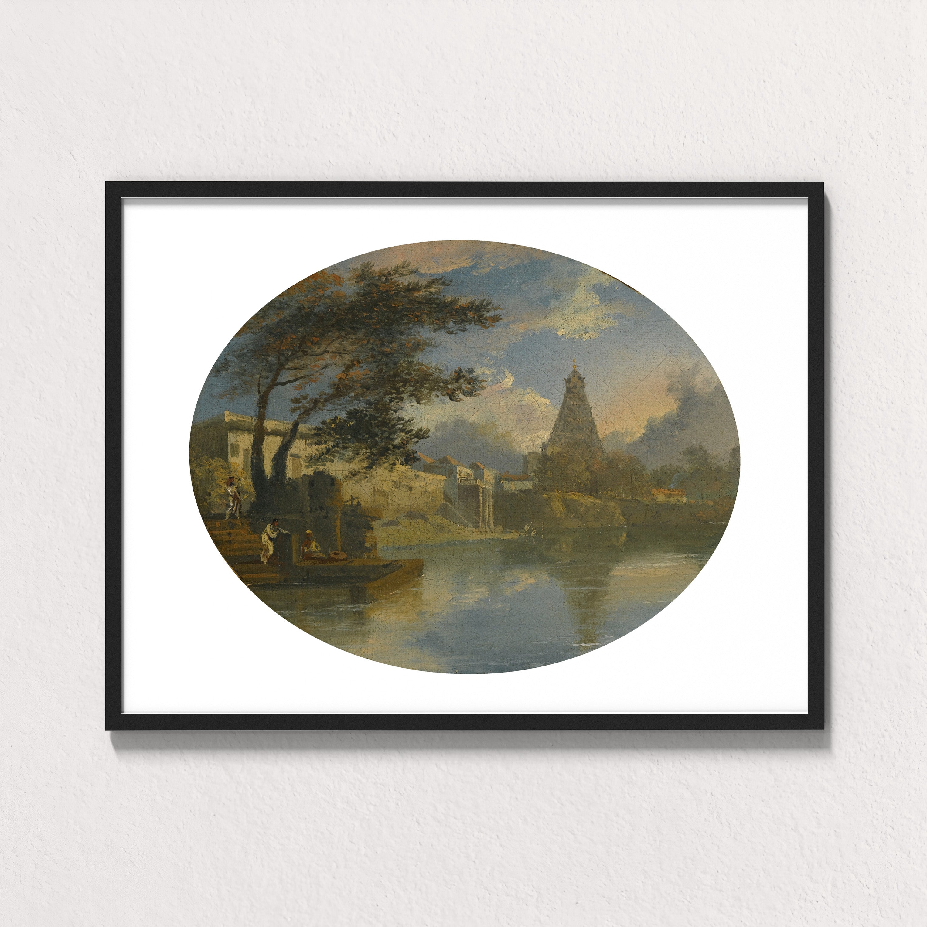 Temple Reflected at Thanjavur invites the viewer into a tranquil meeting of water, sky, and sacred stone. Created by Sir Charles D’Oyly in the early 19th century, this evocative archival print presents the Brihadeeswarar Temple rising gently beyond a riverbank, its monumental form softened by atmosphere and mirrored in still water.