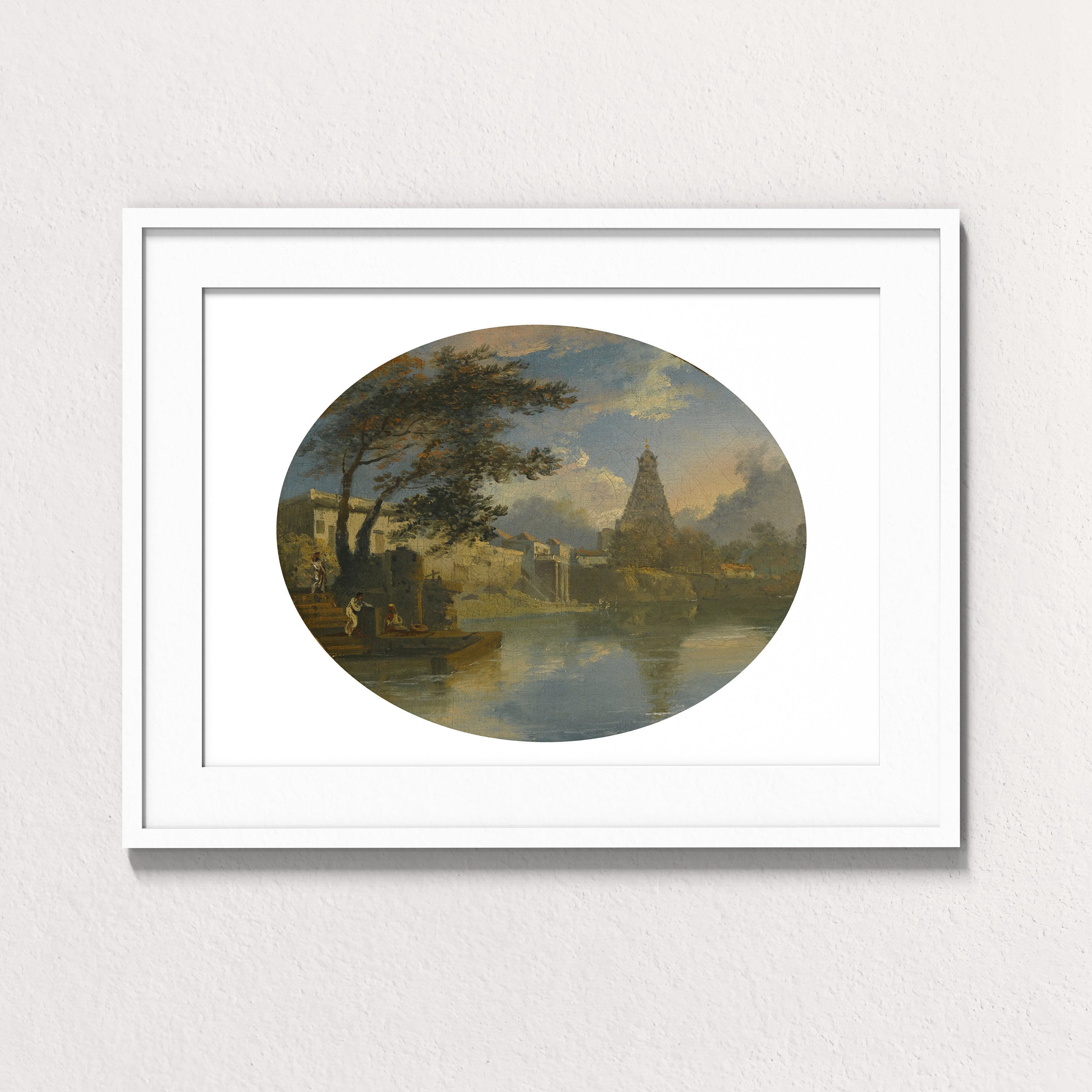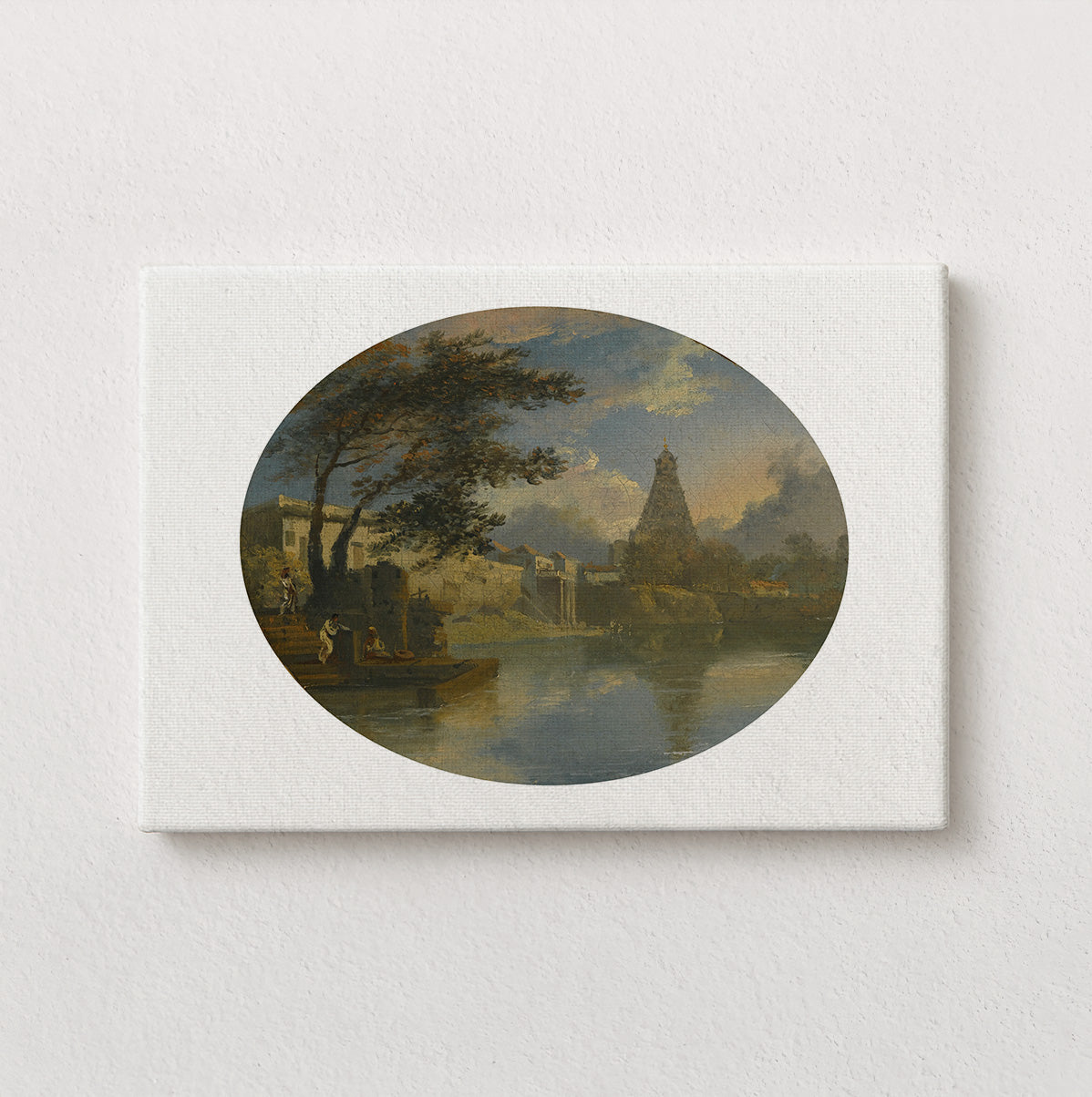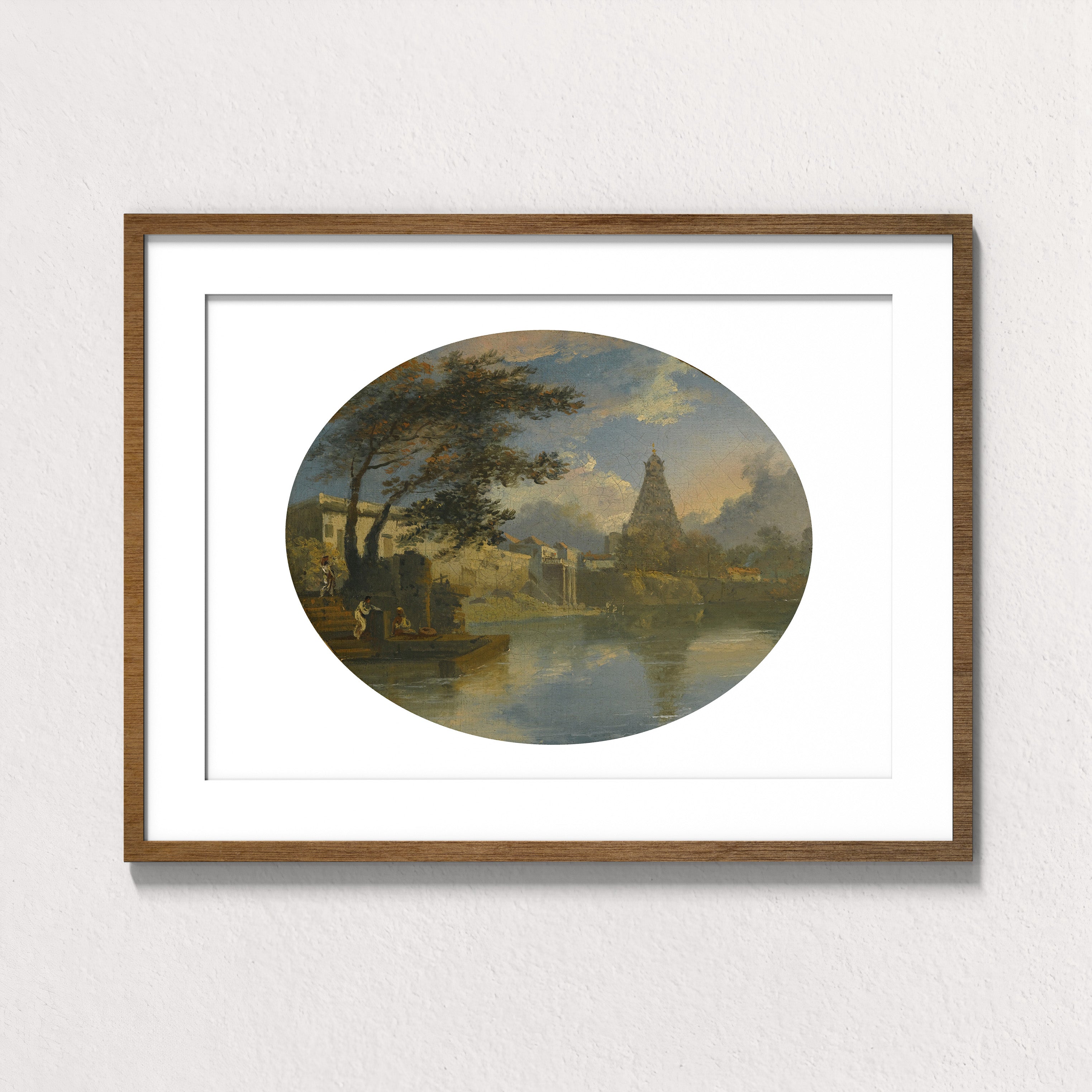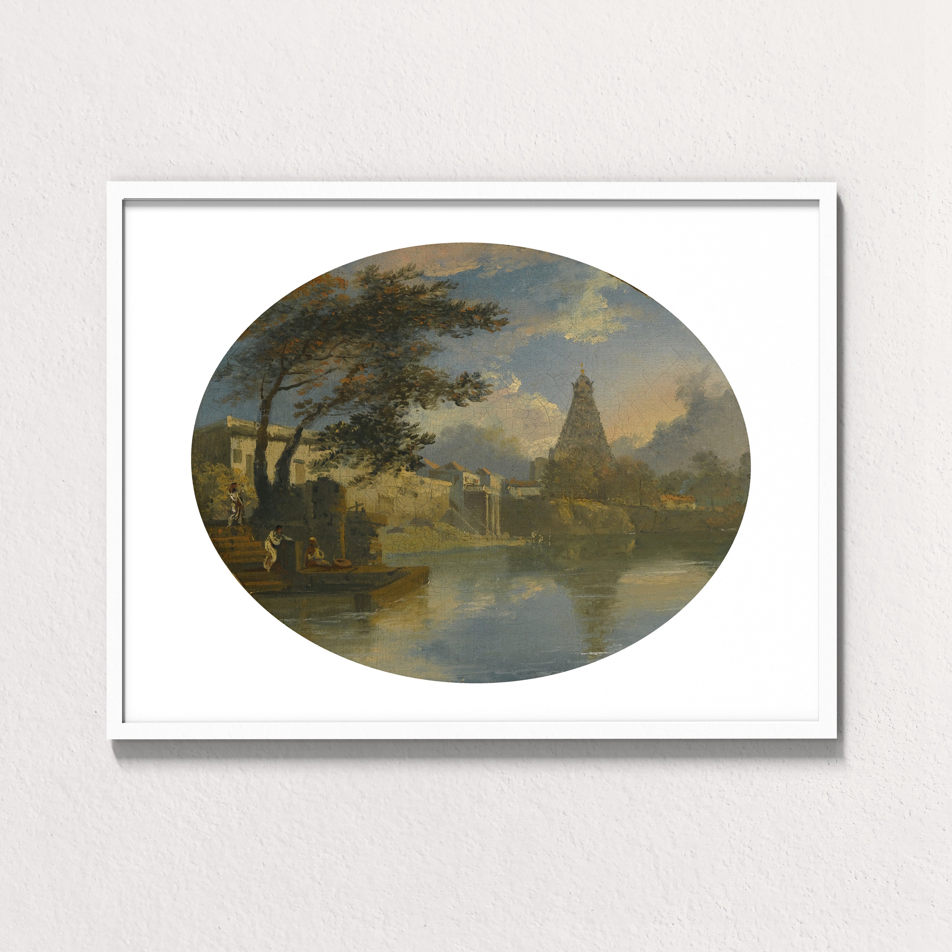 The oval composition lends the scene a meditative calm. Palm trees lean toward the water’s edge, clouds drift quietly across a pale sky, and the temple’s tiered silhouette anchors the horizon with serene authority. The reflection below doubles the architecture, suggesting continuity between earth and element, devotion and environment. Here, the temple does not dominate the landscape; it belongs to it.