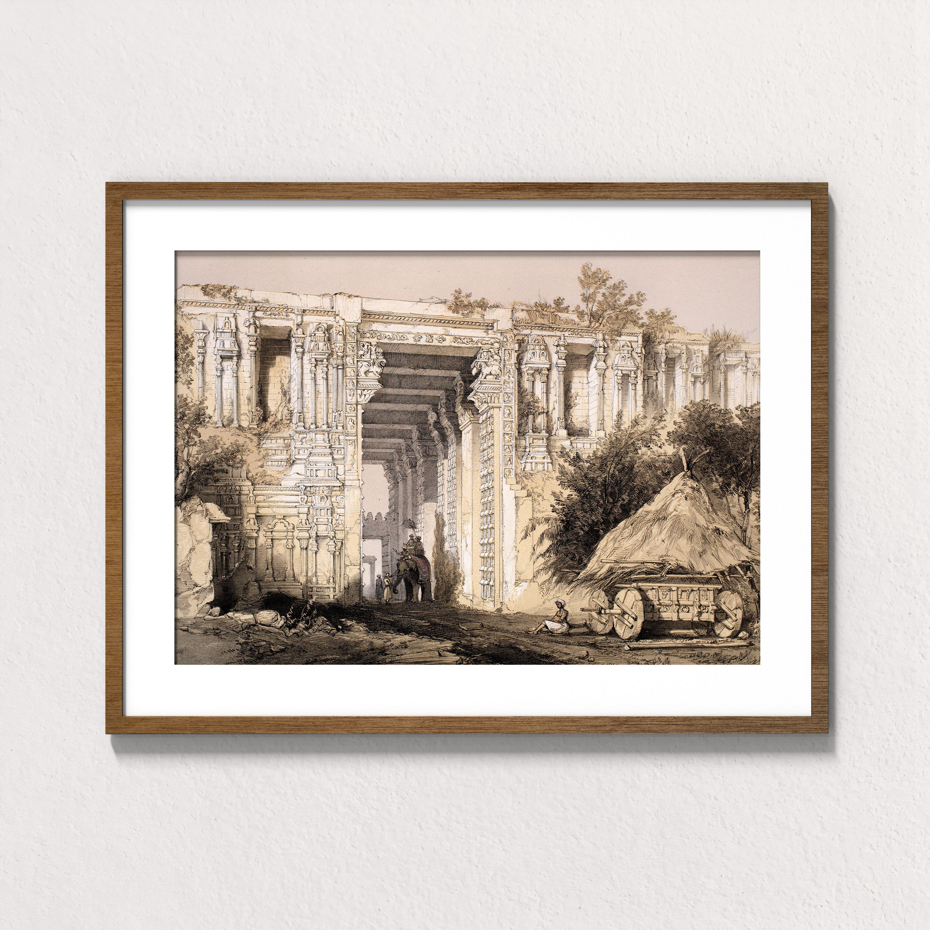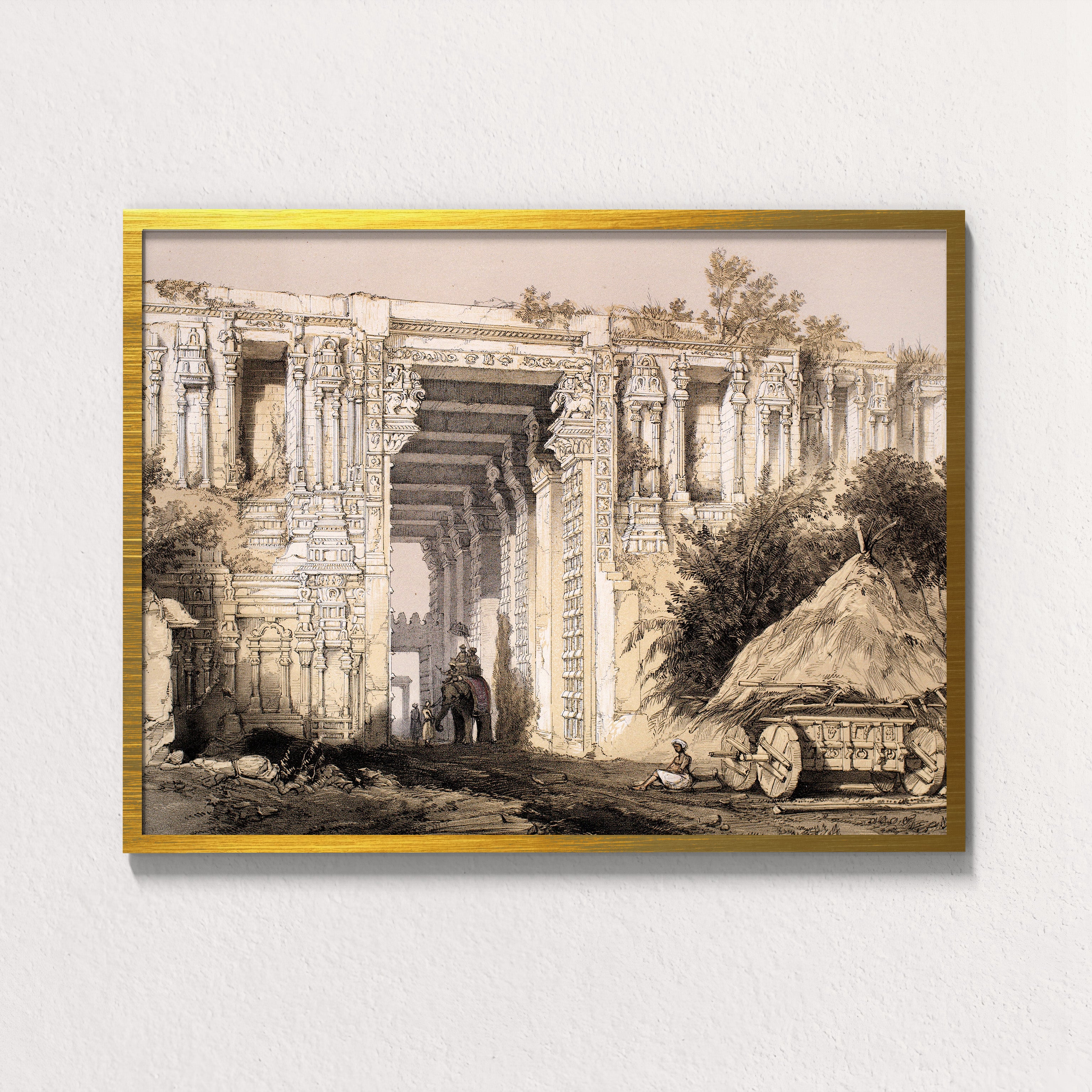 Threshold of Srirangam is a quiet meditation on endurance. Rendered as a sepia lithograph in the early 19th century, this work depicts the monumental gateway of the Srirangam Temple not as a pristine monument, but as a living structure shaped by time, weather, and daily use.